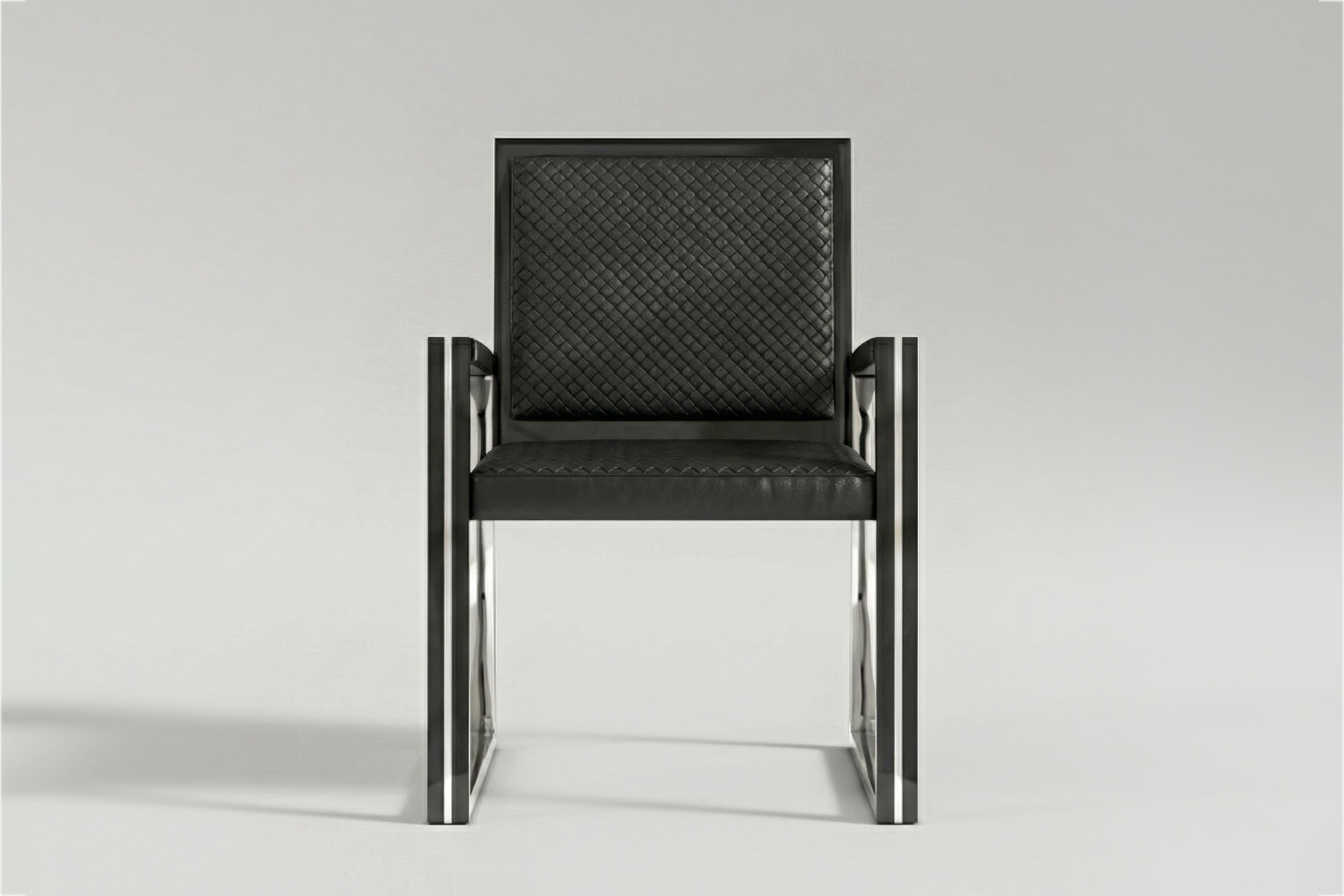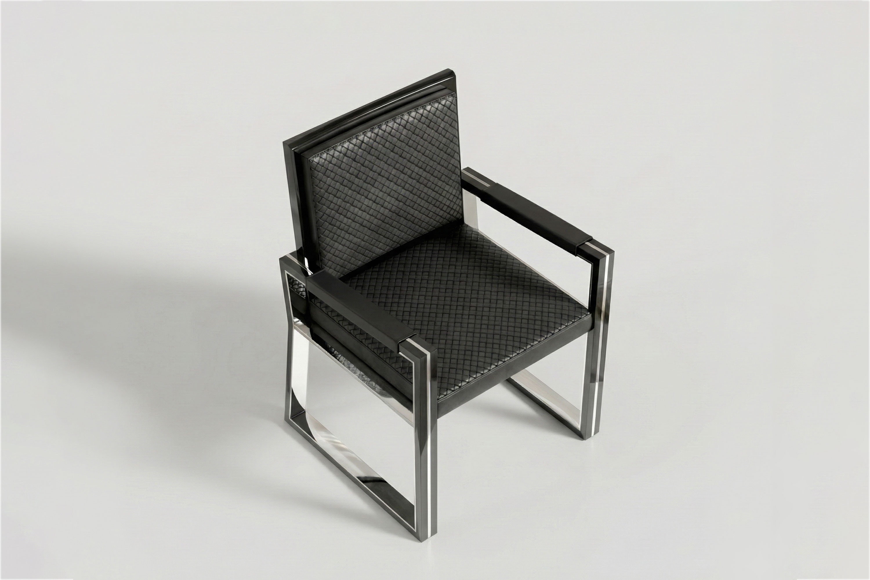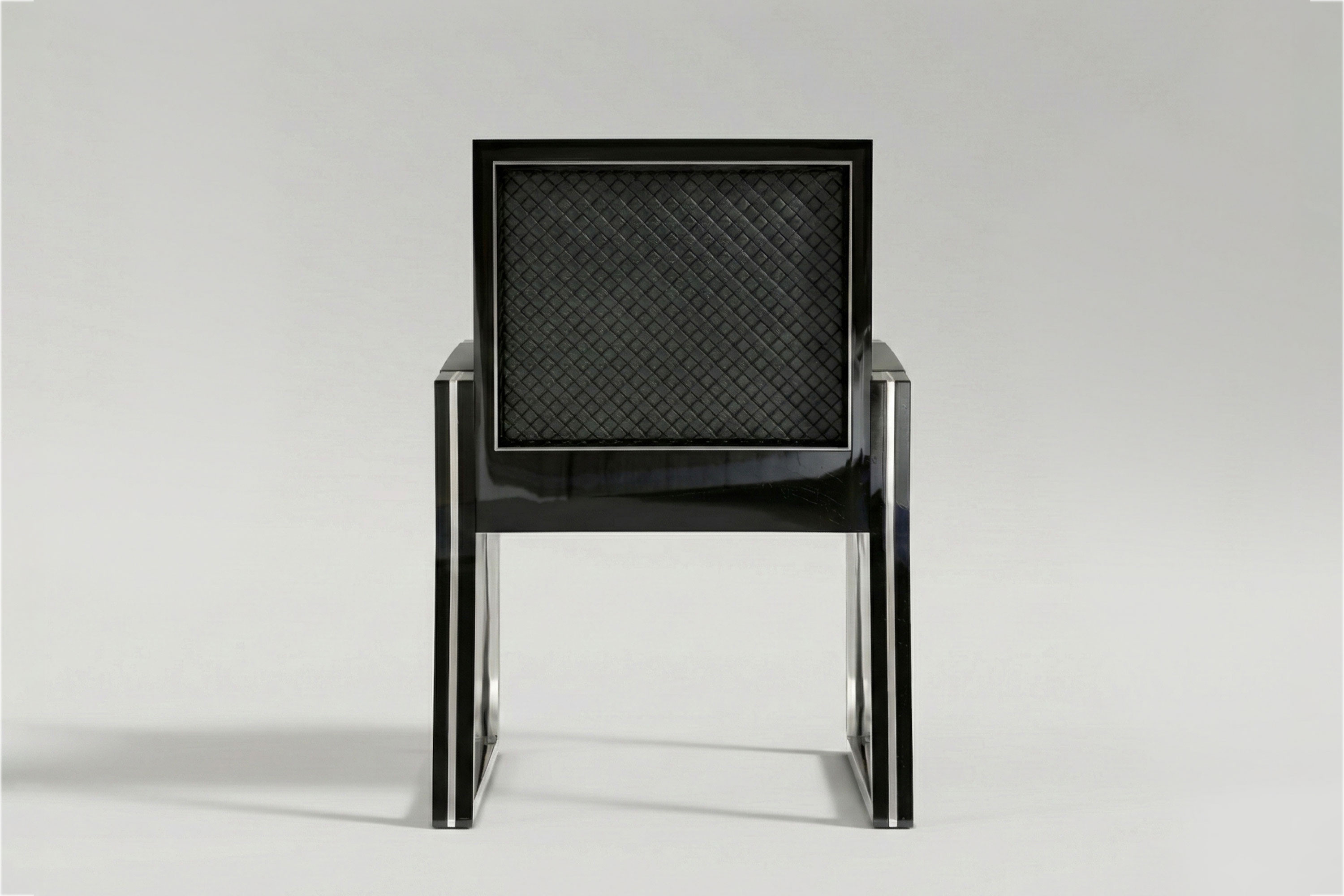 This edition executes a flawless, cool-toned dialogue of material contrast. High-polished stainless steel interior planes capture and amplify ambient light, sharply juxtaposed against the deep, light-absorbing obsidian lacquer that traces the exterior edges. This rigid, dual-toned metallic geometry is beautifully intercepted by the seat and armrests, which are enveloped in a rich, dark Intrecciato leather. Acting as a dynamic, breathable surface, the meticulous artisanal weave introduces an organic tactile depth to the sleek metal, ensuring that the chair’s striking, avant-garde aesthetics yield effortlessly to uncompromising, lasting comfort.