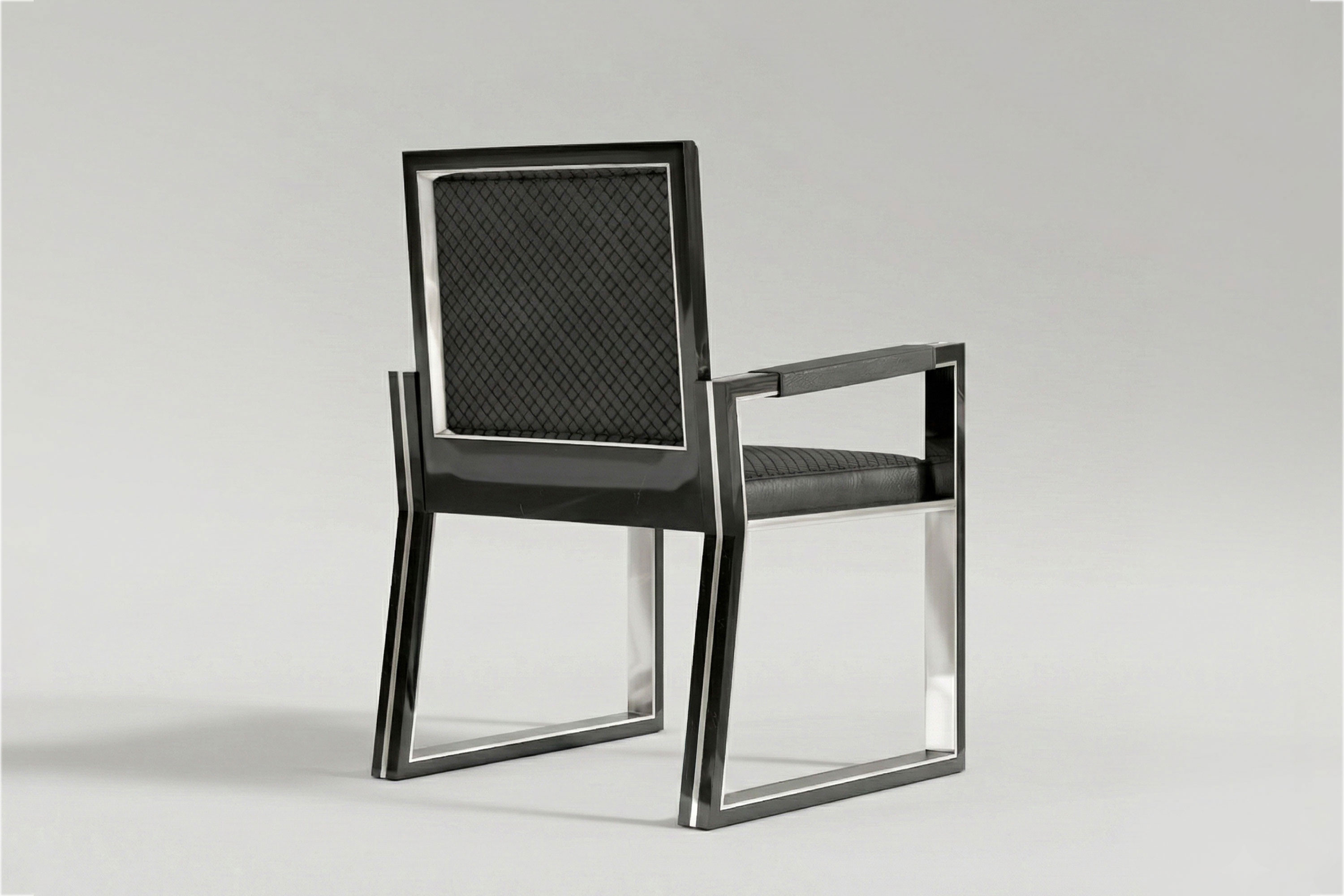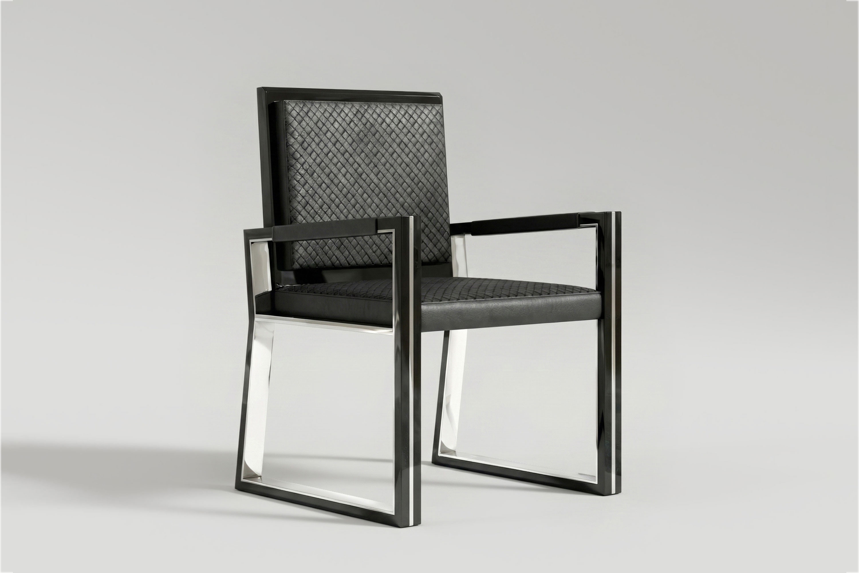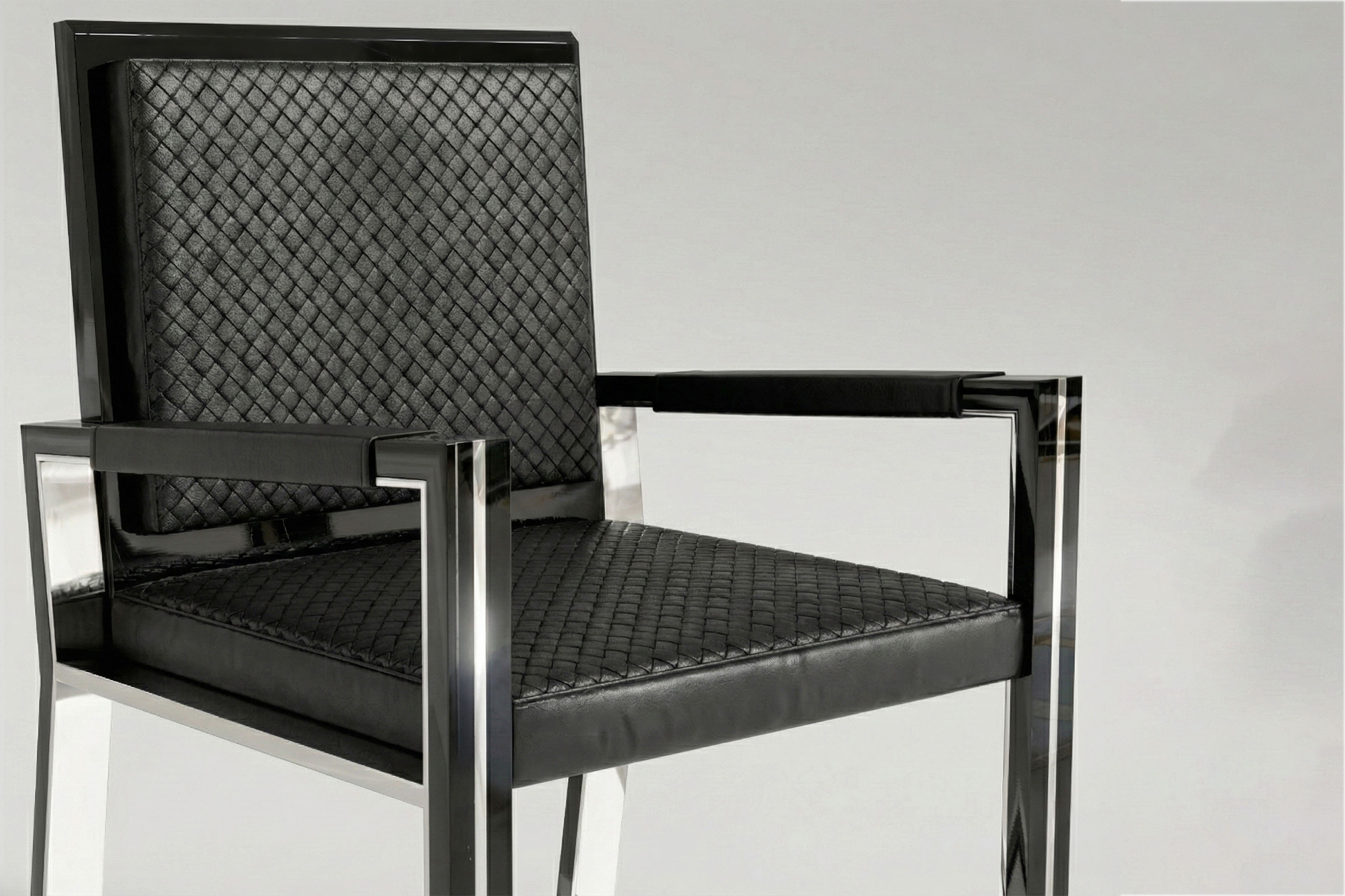 This edition executes a flawless, cool-toned dialogue of material contrast. High-polished stainless steel interior planes capture and amplify ambient light, sharply juxtaposed against the deep, light-absorbing obsidian lacquer that traces the exterior edges. This rigid, dual-toned metallic geometry is beautifully intercepted by the seat and armrests, which are enveloped in a rich, dark Intrecciato leather. Acting as a dynamic, breathable surface, the meticulous artisanal weave introduces an organic tactile depth to the sleek metal, ensuring that the chair’s striking, avant-garde aesthetics yield effortlessly to uncompromising, lasting comfort.