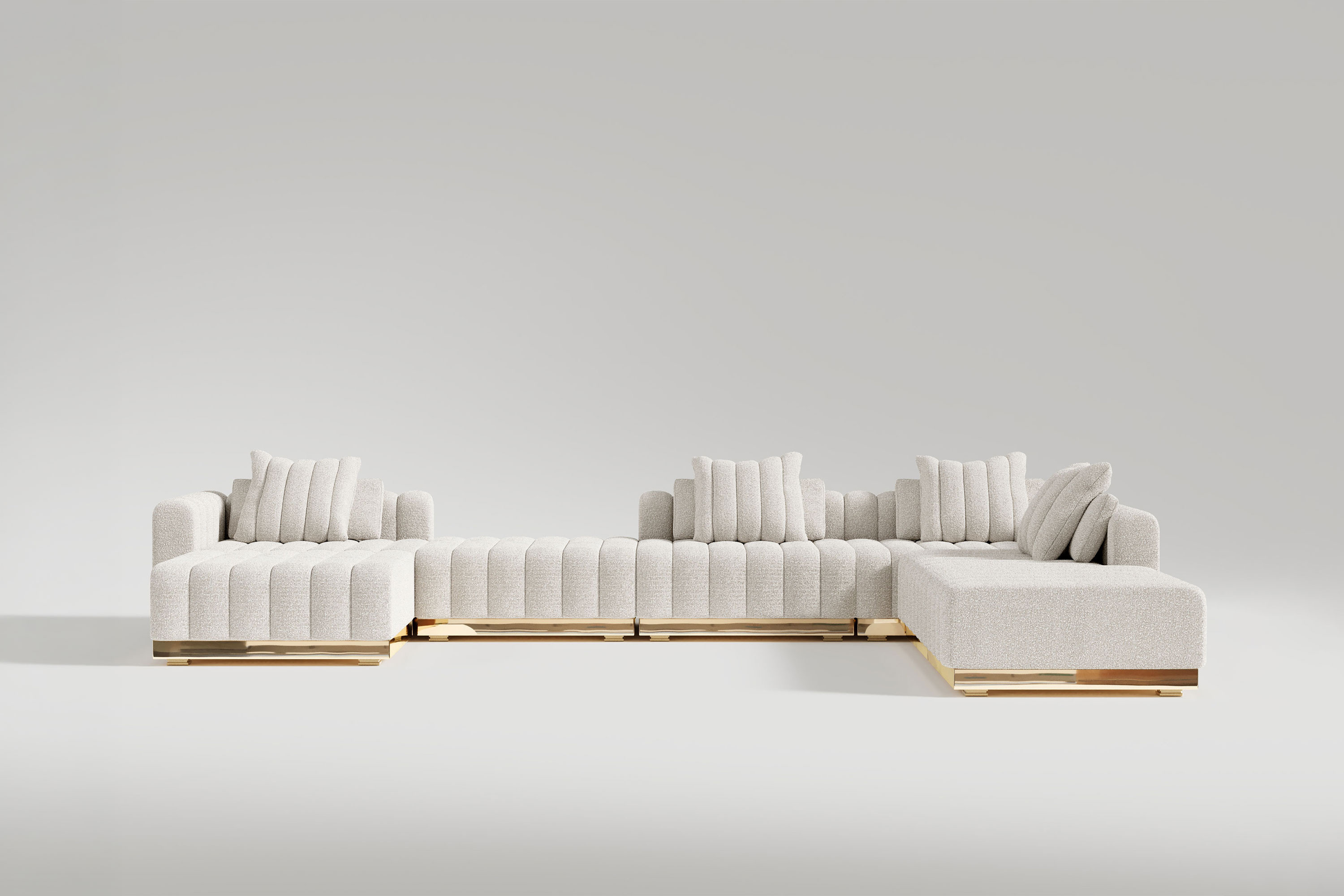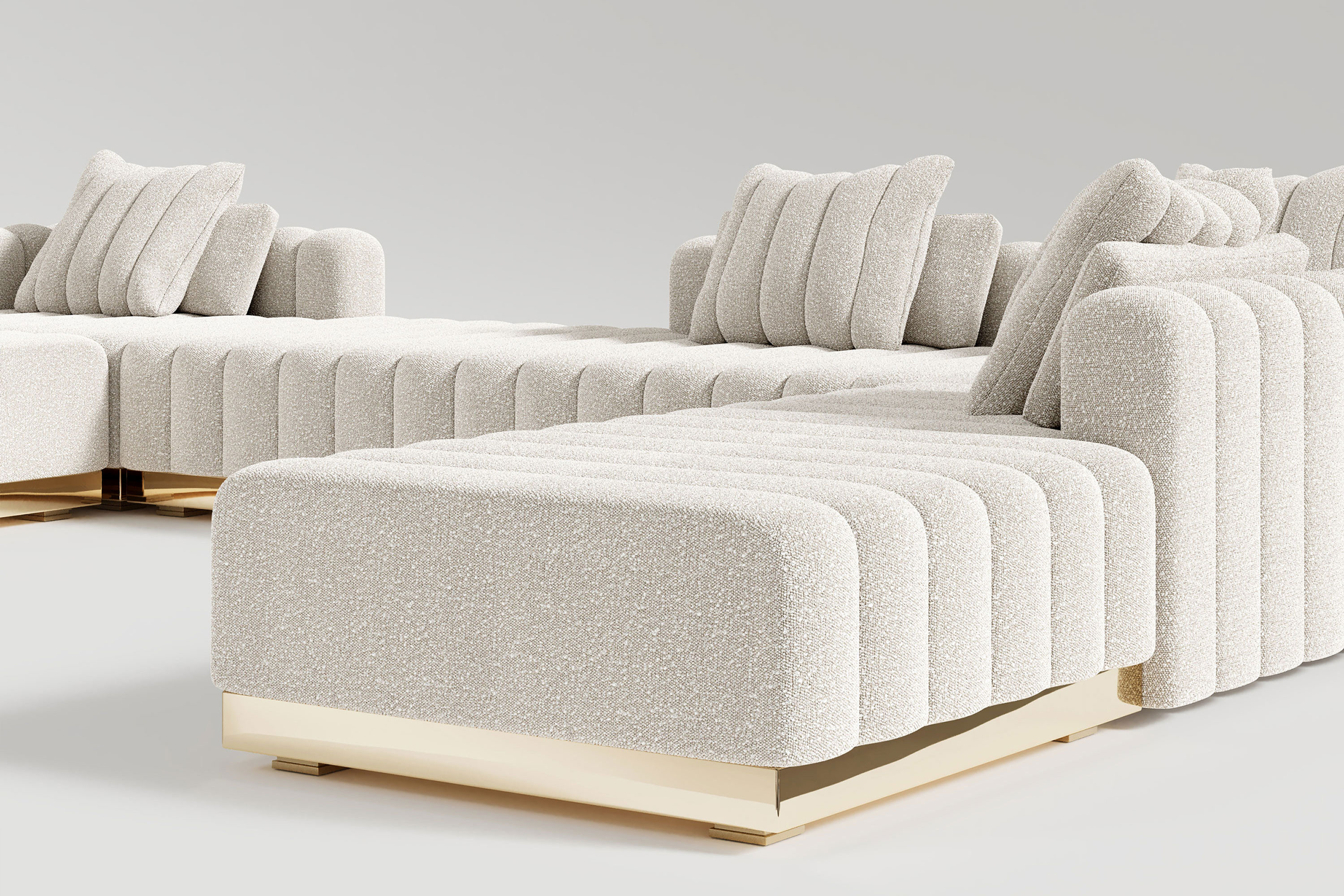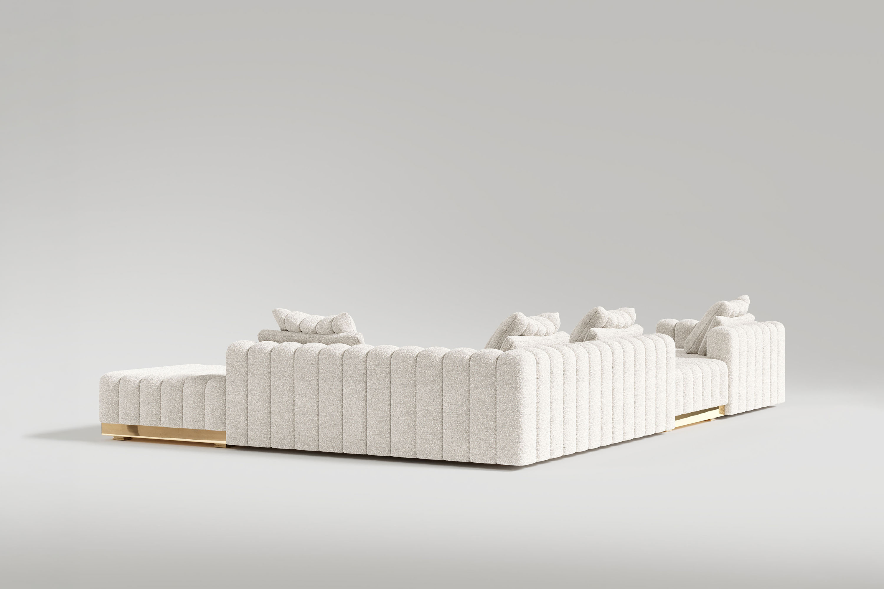 This system offers unparalleled freedom, allowing you to customize your own fluid seating configuration piece by piece. Whether arranged in a massive U-shape or a sweeping, serpentine curve, the entire structure is unified by a continuous, high-polished bronze base that infuses the space with a radiant, golden warmth. The individual modular units feature deeply channeled, oversized cushioning enveloped in premium luxury bouclé. This refined tufting and exceptionally wide seating area guarantee an immersive, sink-in sanctuary that perfectly marries monumental scale with intimate, everyday comfort.