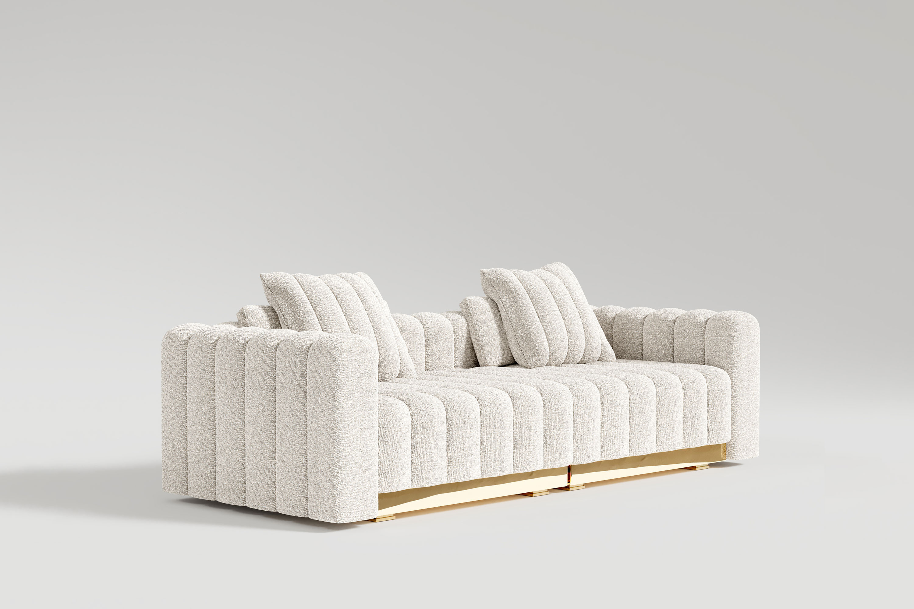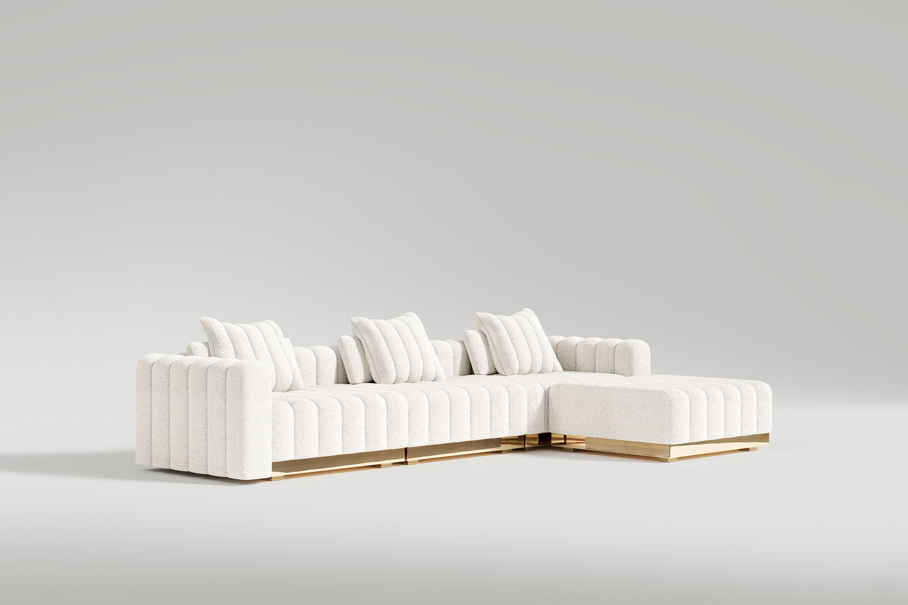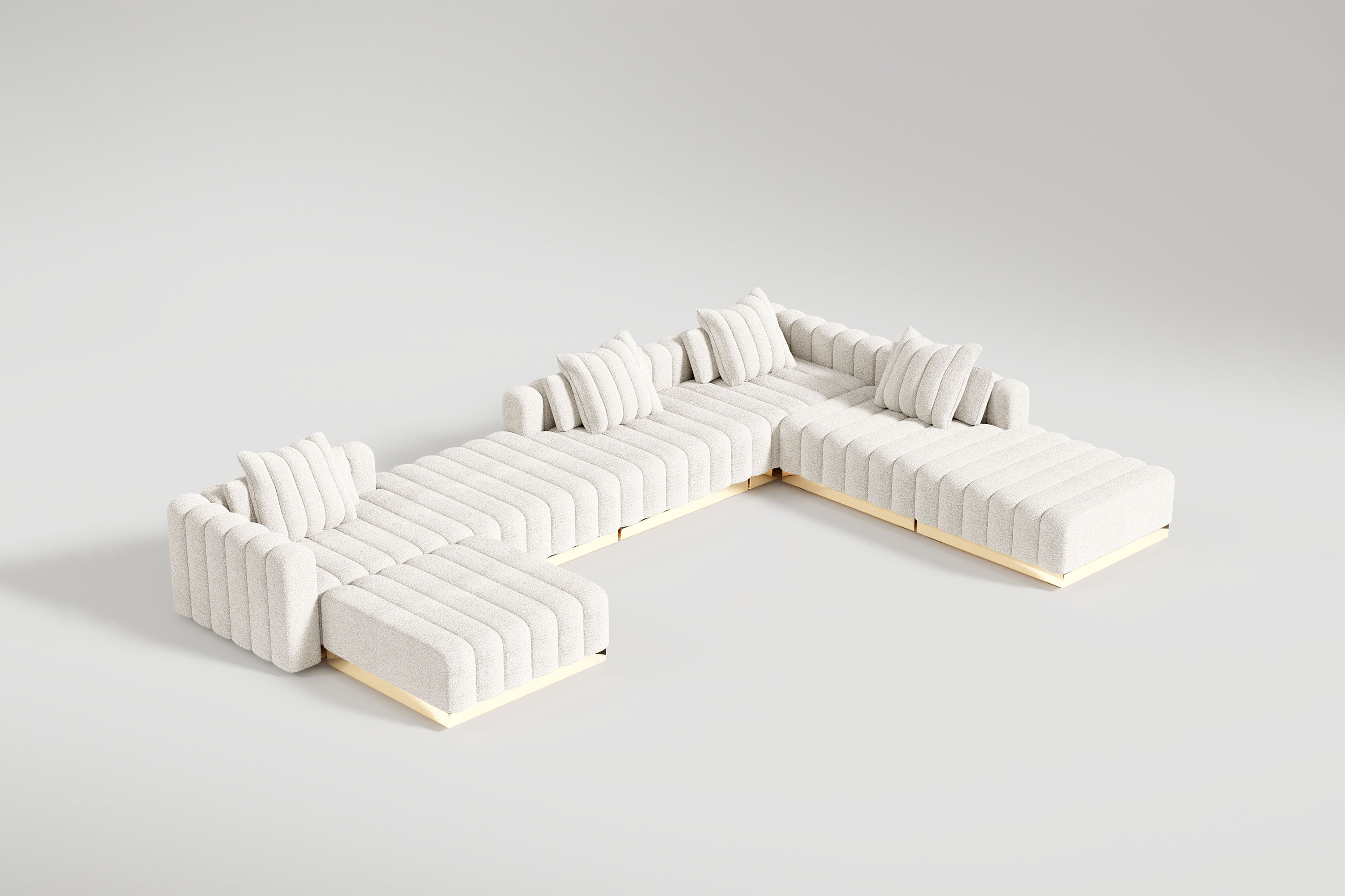 This system offers unparalleled freedom, allowing you to customize your own fluid seating configuration piece by piece. Whether arranged in a massive U-shape or a sweeping, serpentine curve, the entire structure is unified by a continuous, high-polished bronze base that infuses the space with a radiant, golden warmth. The individual modular units feature deeply channeled, oversized cushioning enveloped in premium luxury bouclé. This refined tufting and exceptionally wide seating area guarantee an immersive, sink-in sanctuary that perfectly marries monumental scale with intimate, everyday comfort.