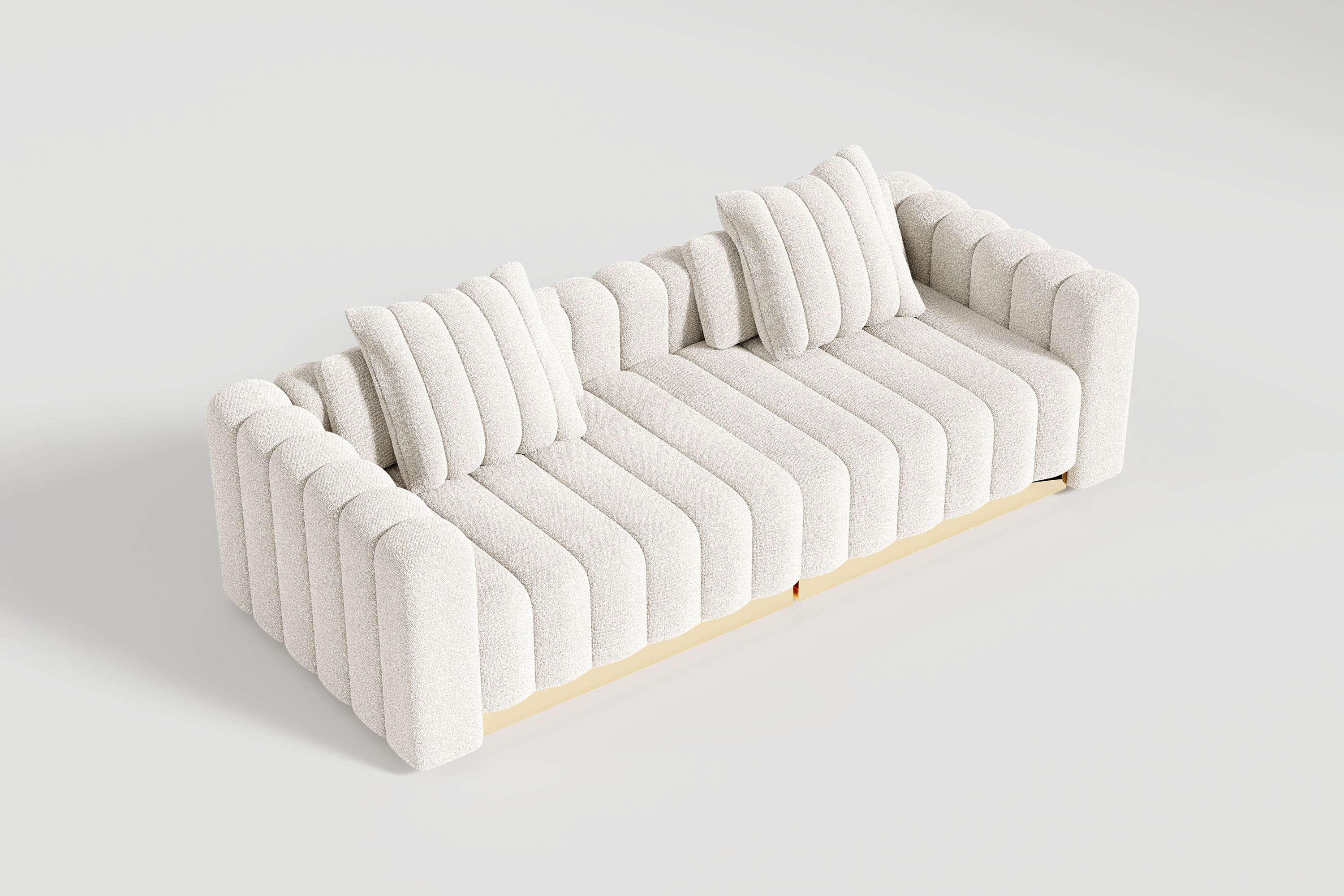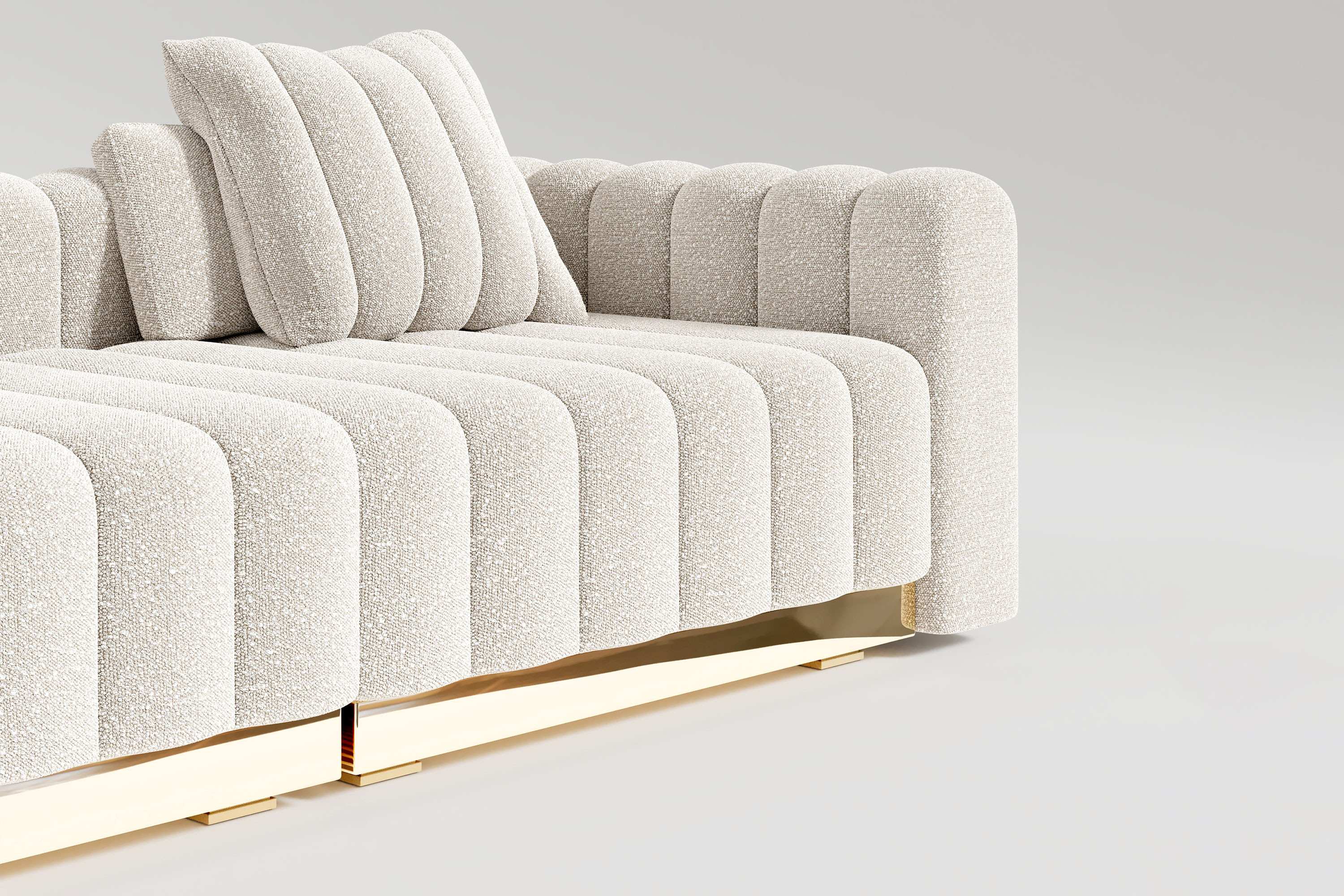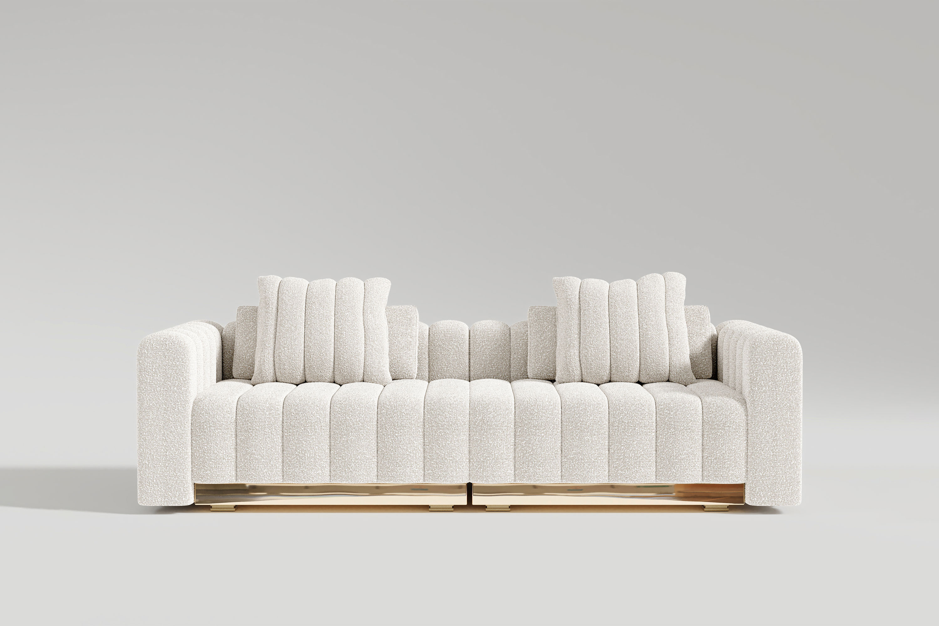 The design executes a breathtaking dialogue of texture and radiant light. The sofa rests upon a meticulously crafted, high-polished bronze plinth base that catches and refracts ambient light, lending the piece a luminous, floating elegance. Rising from this brilliant metallic foundation is a deeply channeled, voluminous seating area enveloped in premium luxury bouclé. The refined tufting and sumptuous, oversized cushioning create an immersive, sink-in sanctuary that promises the ultimate relaxation experience without ever compromising its high-fashion silhouette.