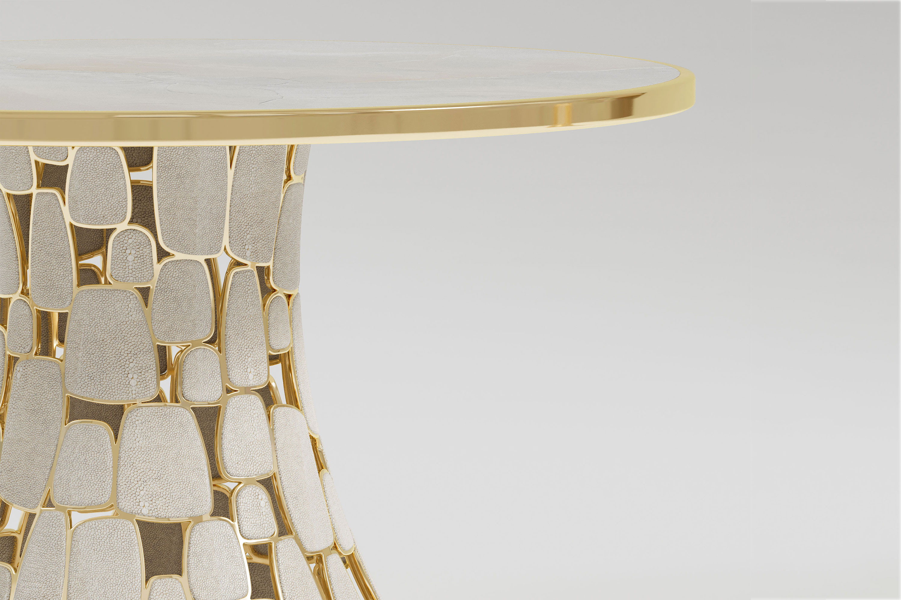 This edition executes a breathtaking dialogue of tactile luxury. The foundation features an artfully sculpted, high-polished bronze base. Meticulously handcrafted to a brilliant sheen, the metal catches and refracts ambient light, casting dynamic, ever-evolving shadows. Resting upon this radiant base is a sweeping cabinet enveloped in rich, textured shagreen leather, offering a profound sensory contrast to the smooth bronze. The composition is crowned by a breathtaking golden marble tabletop, its natural, intricate veining introducing an organic, sweeping energy to the disciplined form.