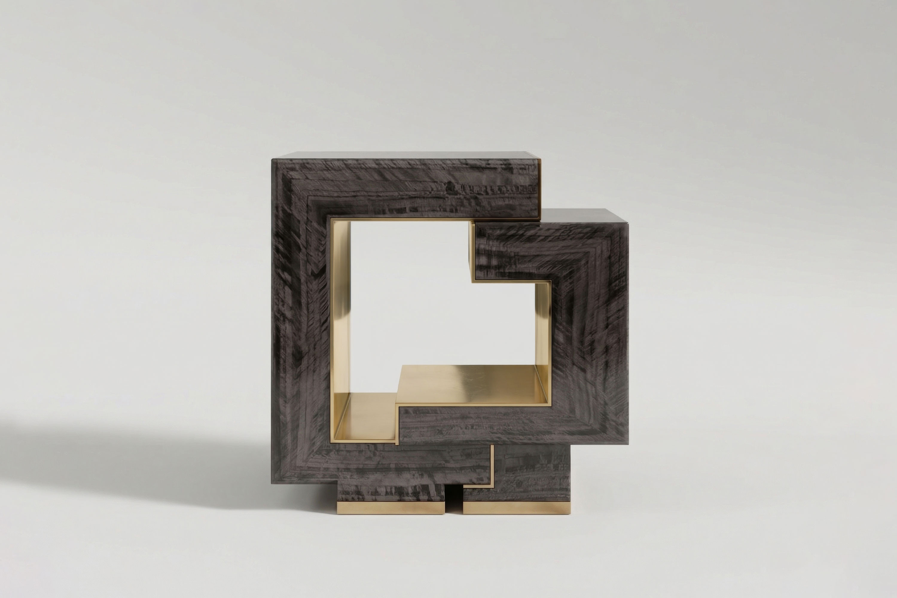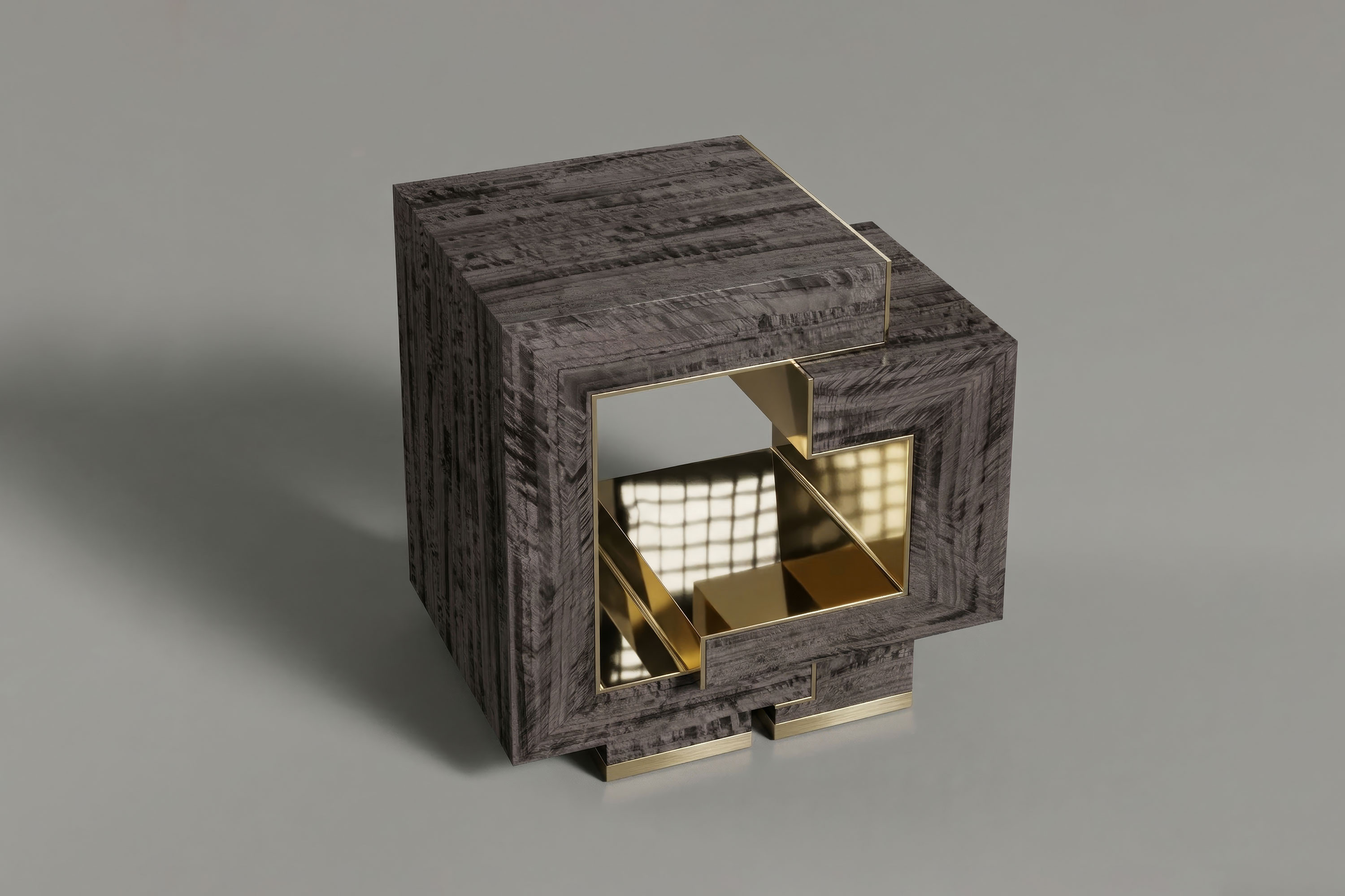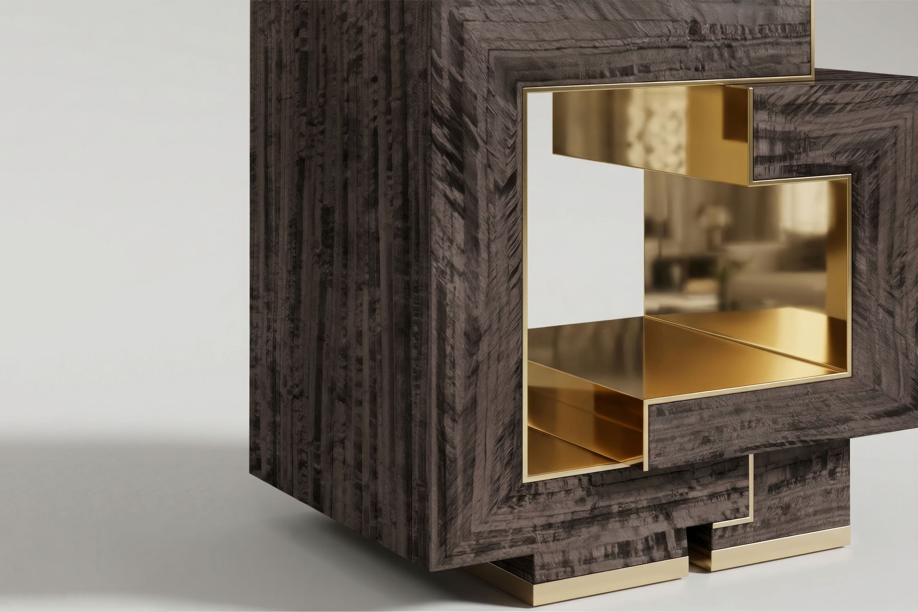 This piece executes a breathtaking dialogue of exterior subtlety and interior radiance. The table’s bold, continuous silhouette is enveloped in premium Eucalyptus veneer, its rich, intricate grain offering a timeless, earthy elegance. However, the true marvel of the design lies in its dramatic, hollowed-out center. The interior void is lined entirely with high-polished bronze, transforming a simple structural cutout into a luminous, light-catching core. This brilliant metallic heart catches and refracts ambient light, creating a stunning visual friction against the dark wood and elevating the table into a definitive statement of contemporary luxury.