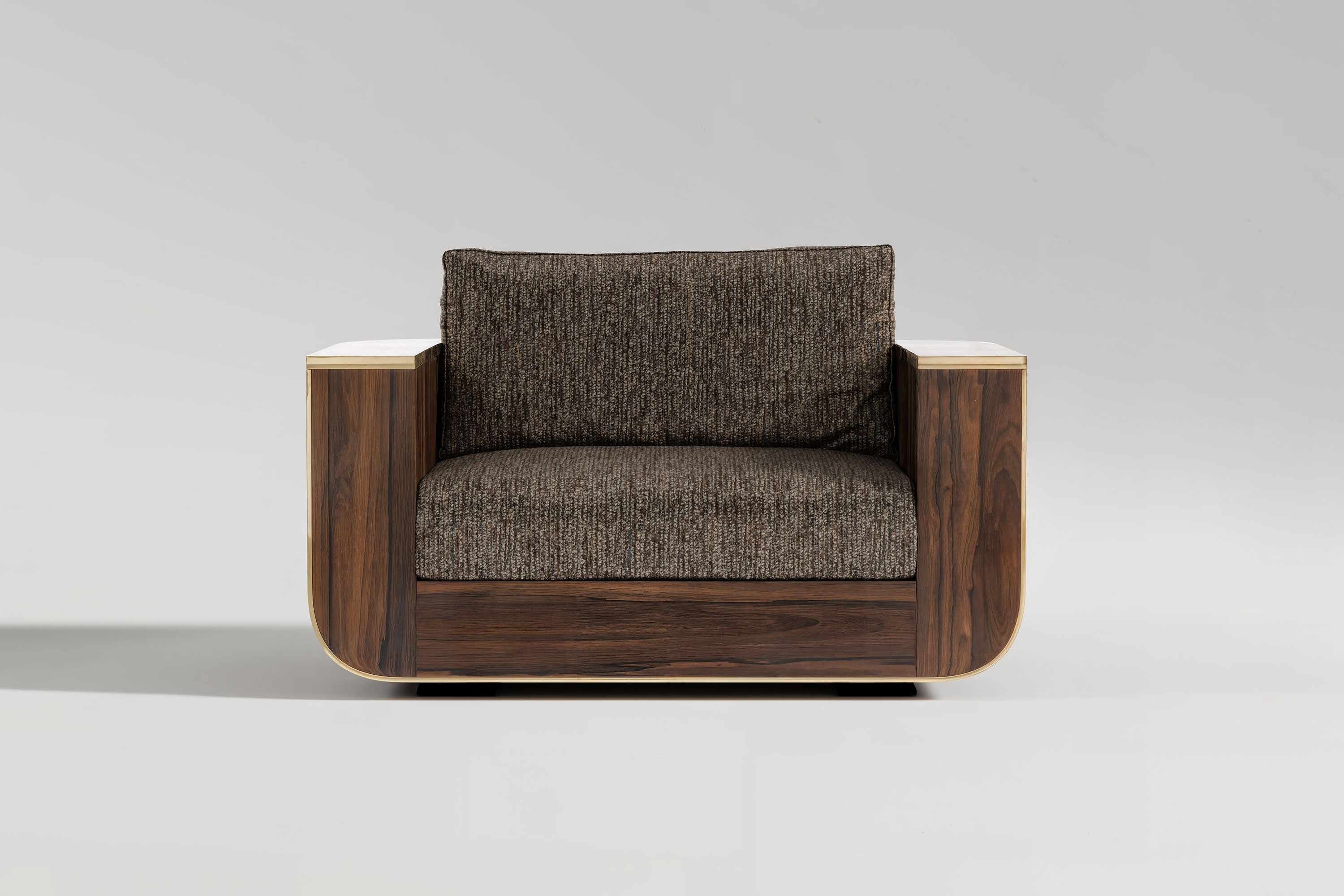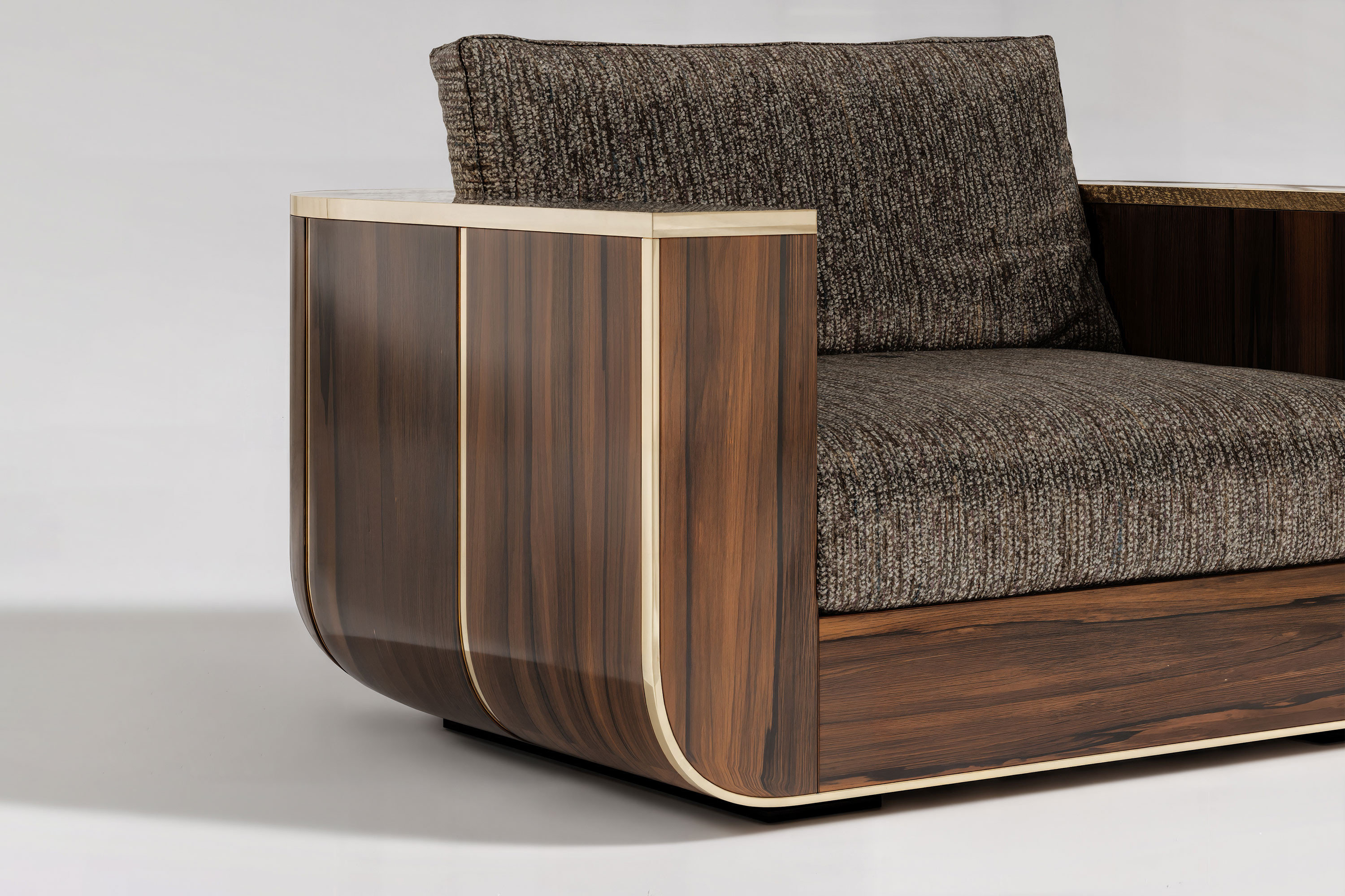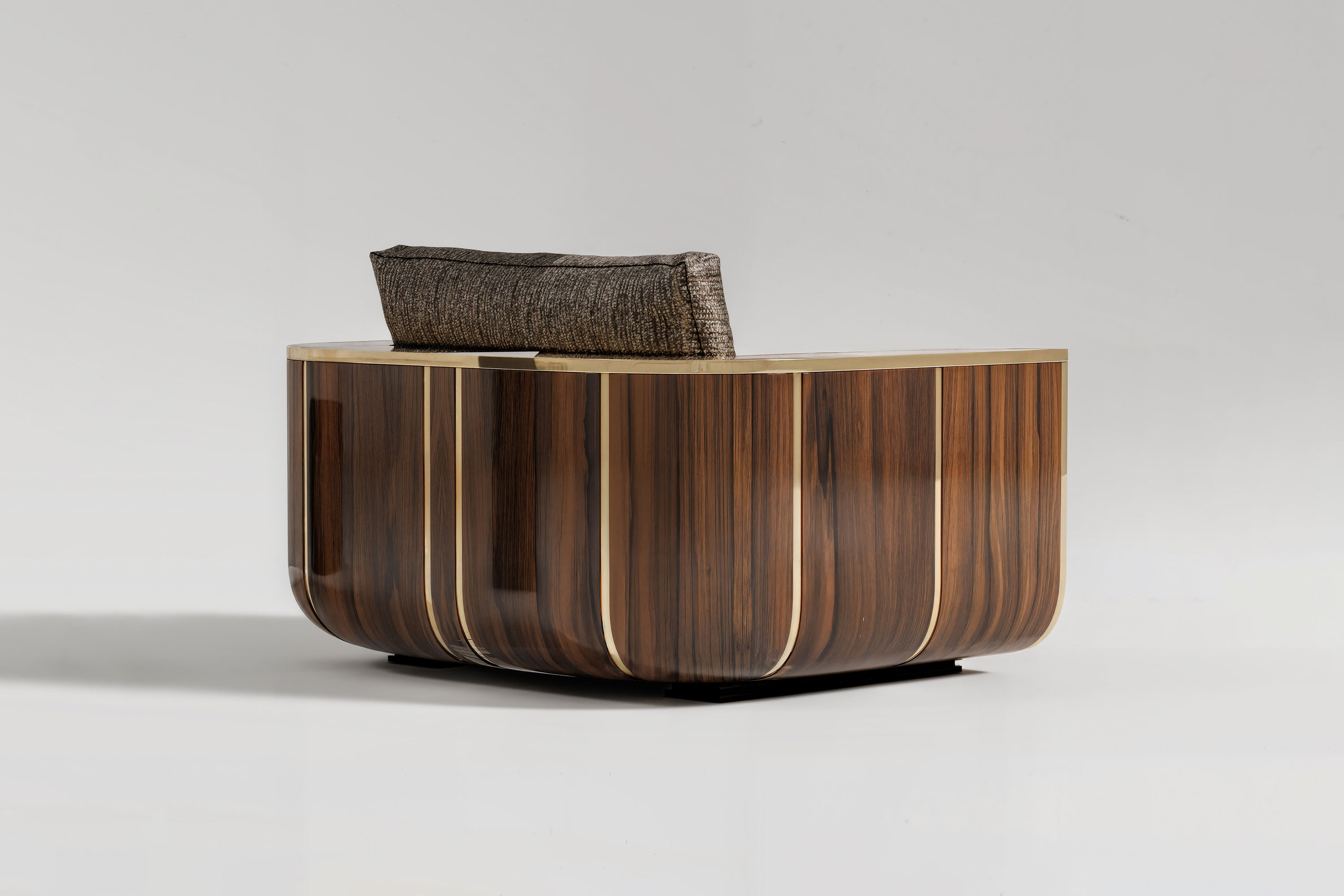 Enhancing this sweeping wooden silhouette are brilliant, high-polished bronze accents. These radiant metallic details catch and refract ambient light, providing a striking structural contrast against the organic wood and elevating the chair into an irreplaceable masterpiece of high-end, tailored design.
