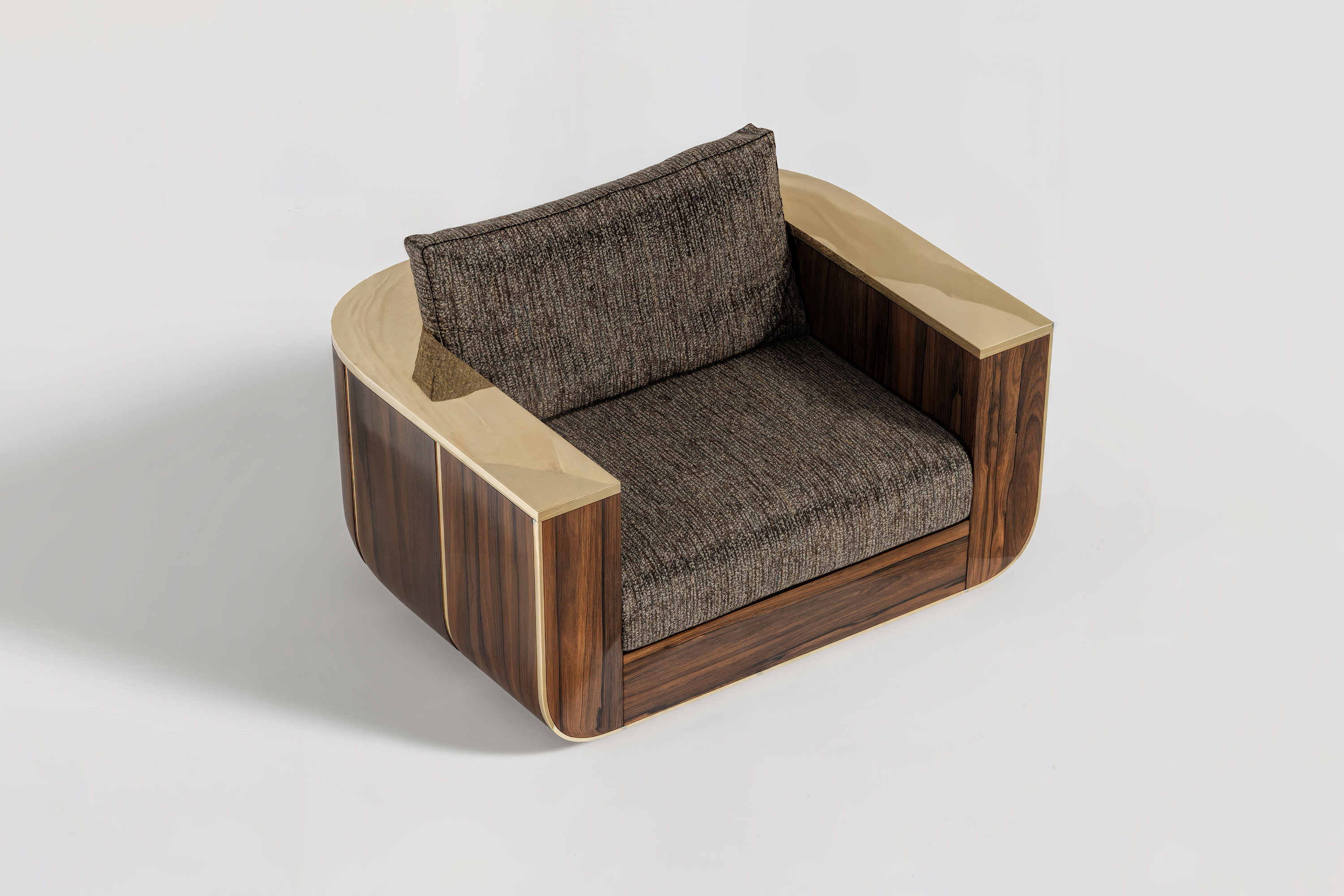 The piece features a breathtaking, continuous exterior shell meticulously crafted from premium American walnut. (Note: I noticed your old text mentioned Ziricote, but the beautiful, warm, flowing grain in these new images is distinctly your American Walnut!) The rich, inviting grain and deep earthy tones of the wood wrap smoothly around the generously plush seating area, creating a private sanctuary of comfort that visually grounds the room.