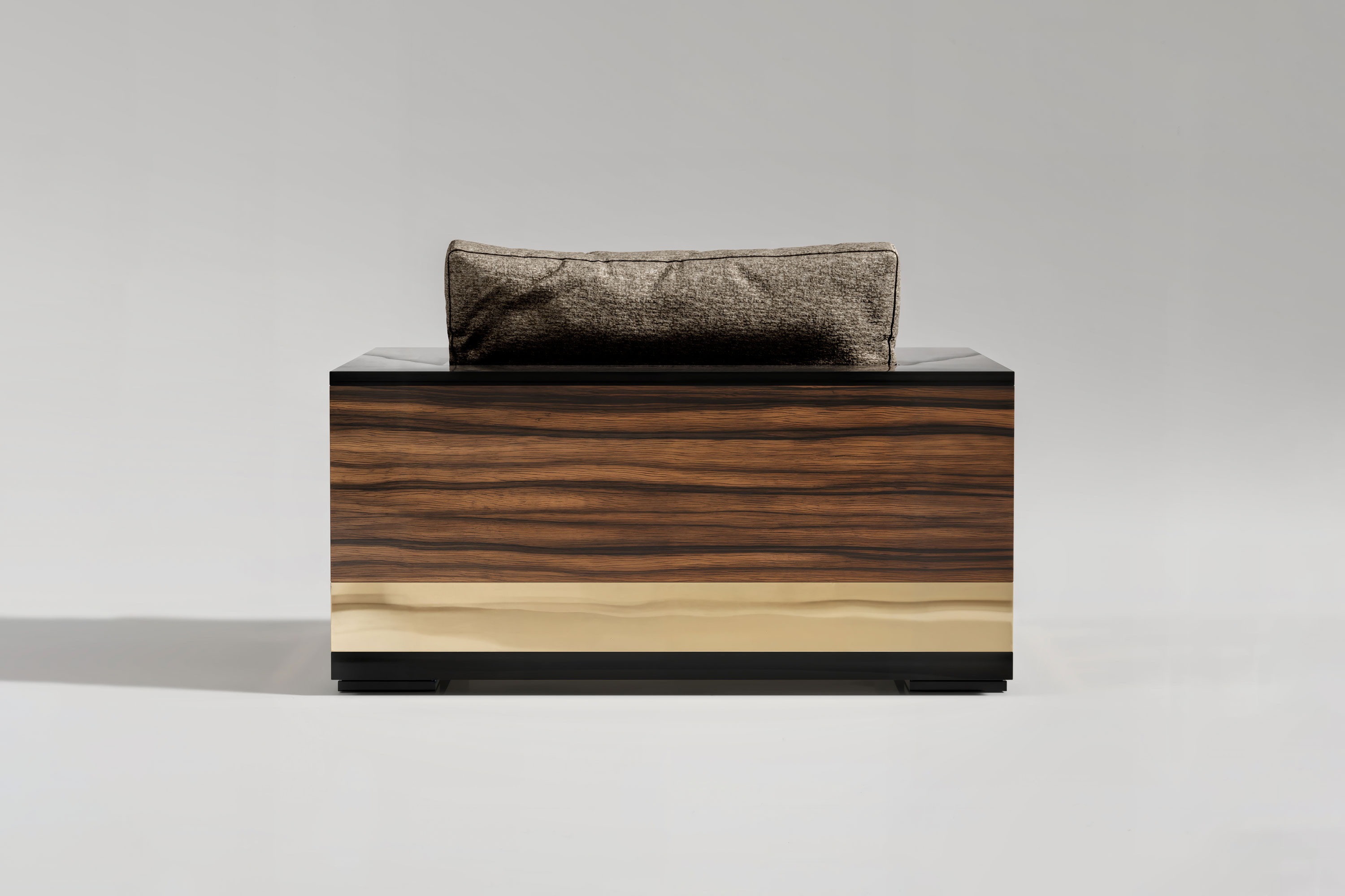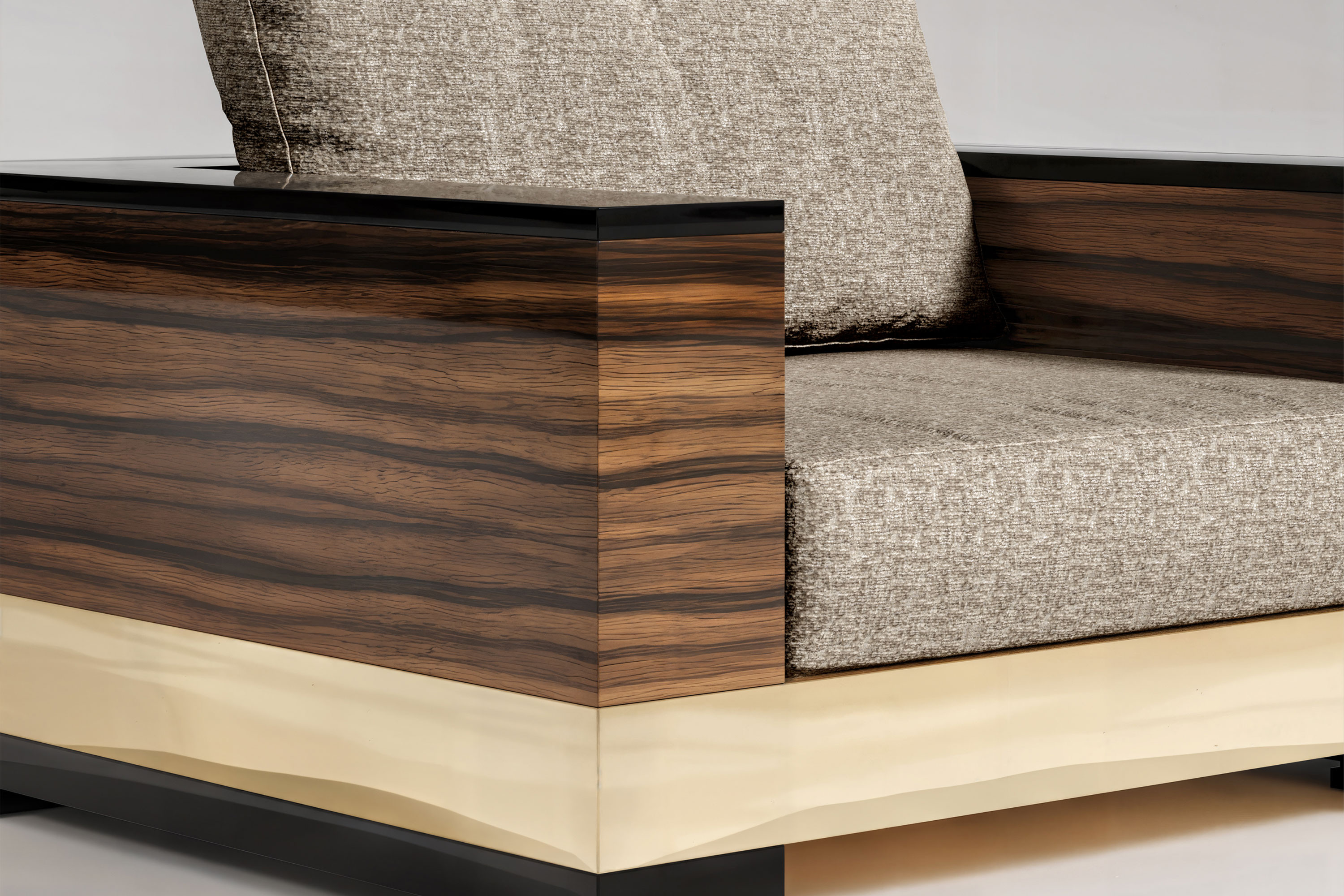 This piece executes a breathtaking symphony of premium materials. The exterior shell is meticulously crafted from rare Ziricote veneer, celebrated worldwide for its dramatic, striking grain patterns that ensure every chair is a singular work of art. This rich, organic frame is elegantly elevated by a radiant, high-polished bronze base and flawlessly accented with sleek, obsidian black lacquer detailing. The interplay between the earthy warmth of the rare wood, the luminous golden metal, and the severe dark lacquer creates a dynamic, highly tailored visual tension.