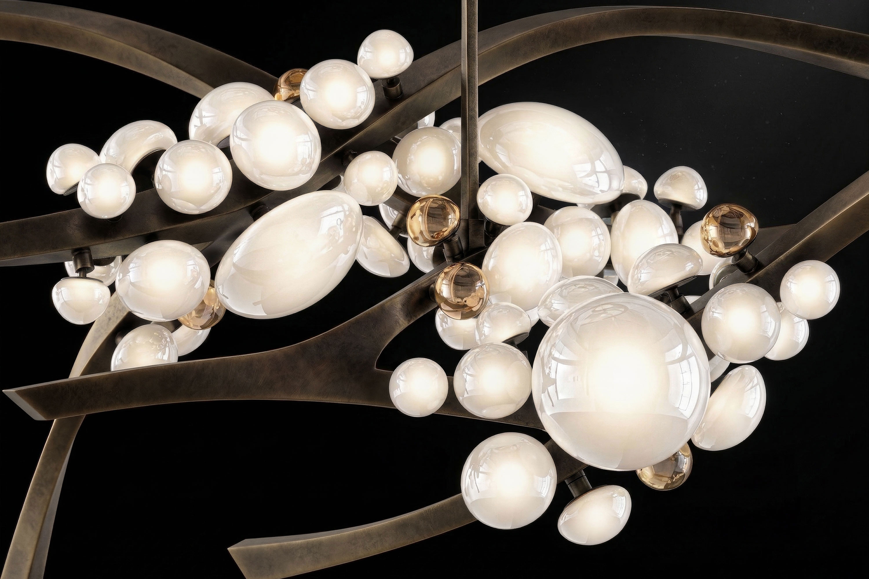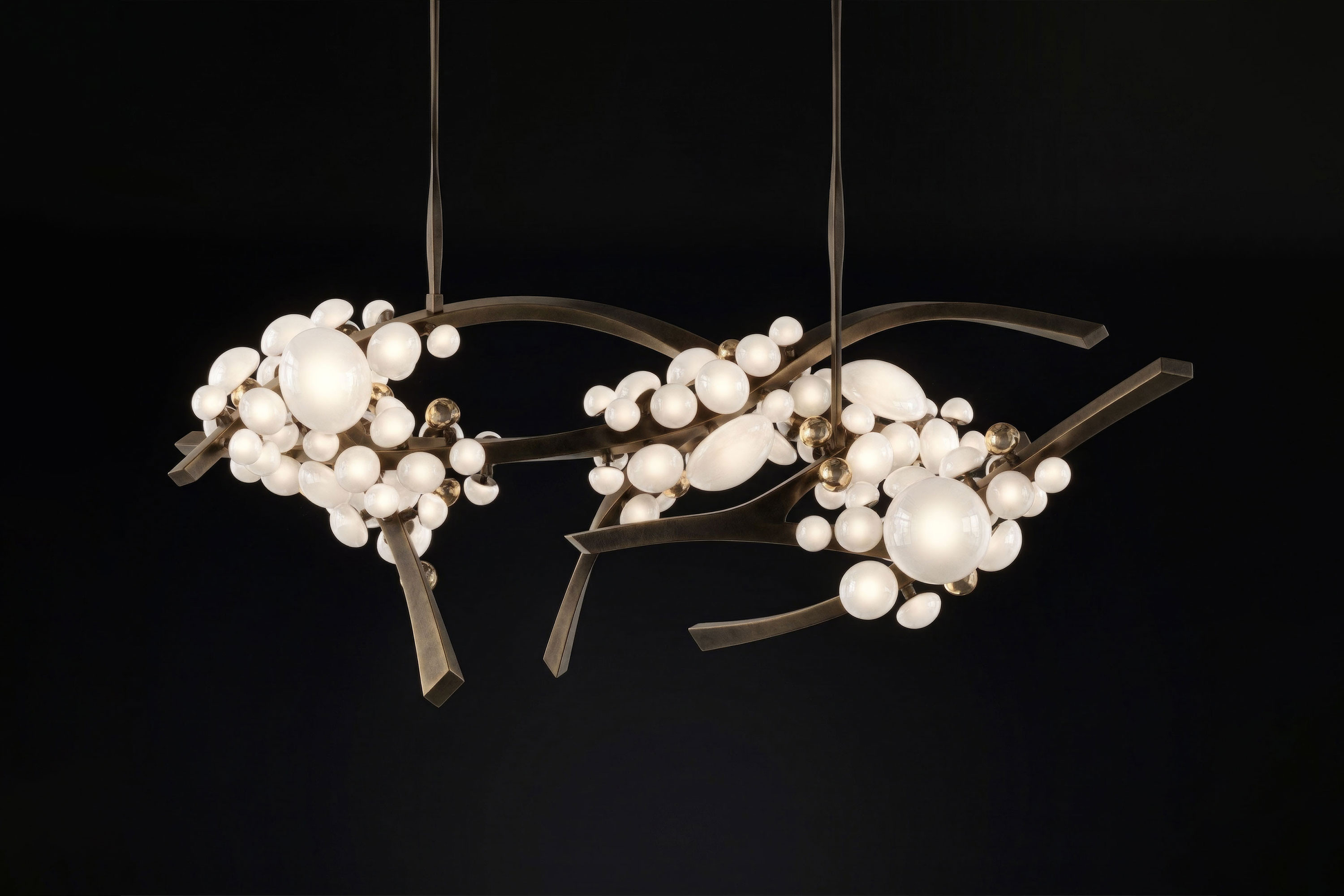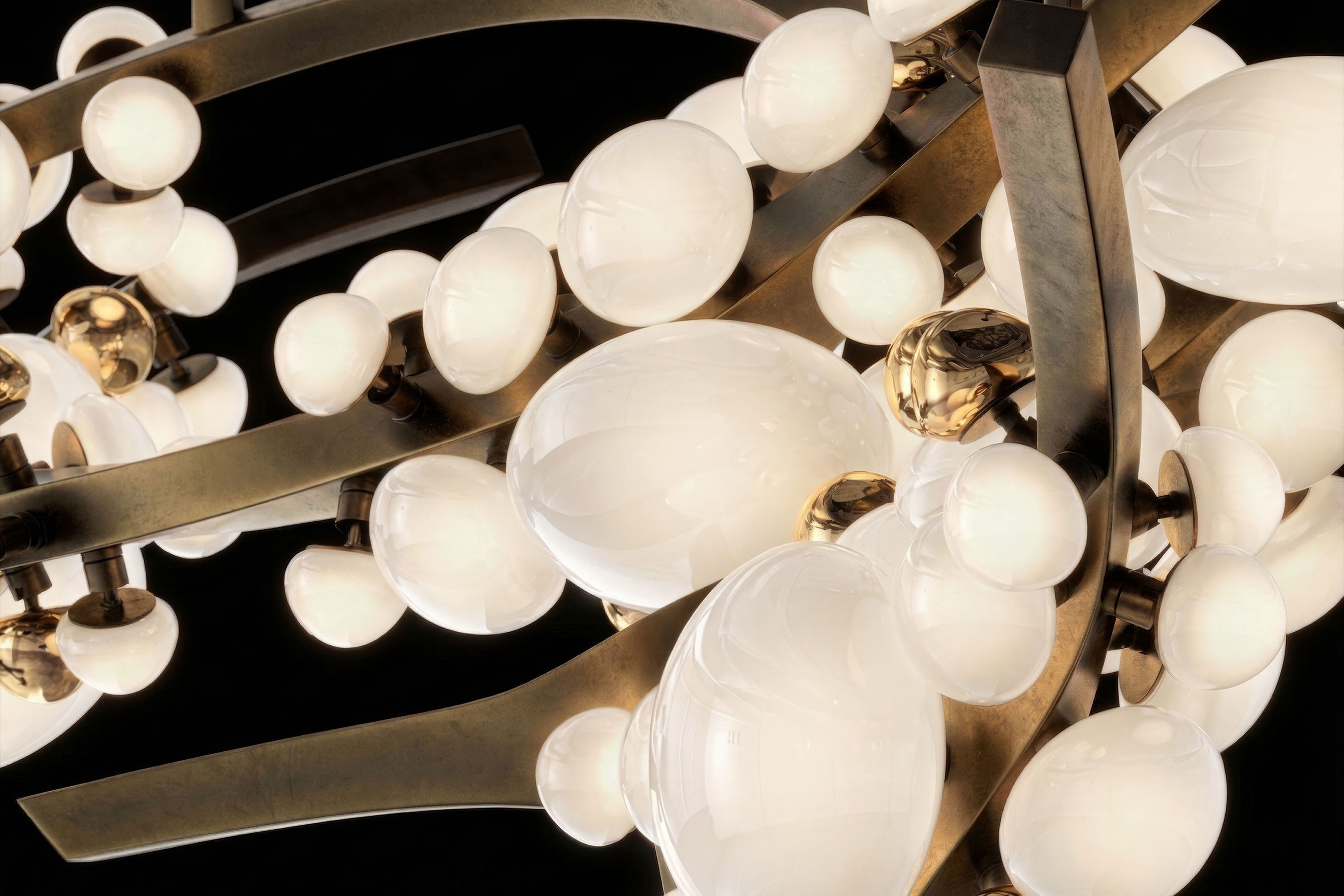 The undeniable soul of this piece lies in its exquisite Murano handmade glass globes. Crafted in varying, organic sizes, these pure milky diffusers resemble delicate blooms. Ingeniously designed, each glass bud can be twisted and turned to the perfect angle, allowing for a completely bespoke illumination experience. Supporting this radiant canopy is an intricate, branch-like frame masterfully forged from patina bronze. The rich, deep texture of the vintage-inspired metalwork provides a profound earthy contrast to the soft glass, ensuring the chandelier appears almost alive with organic movement.