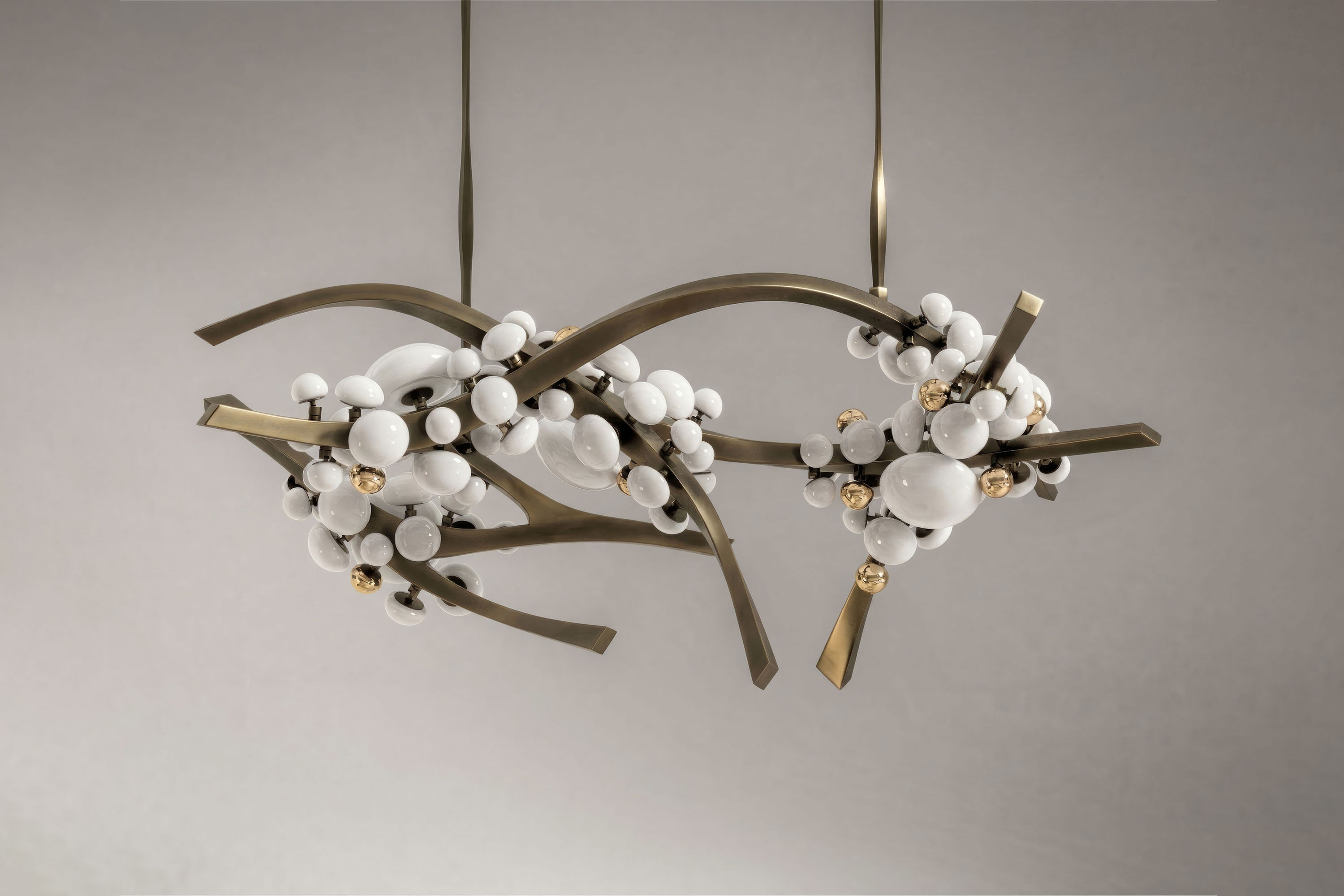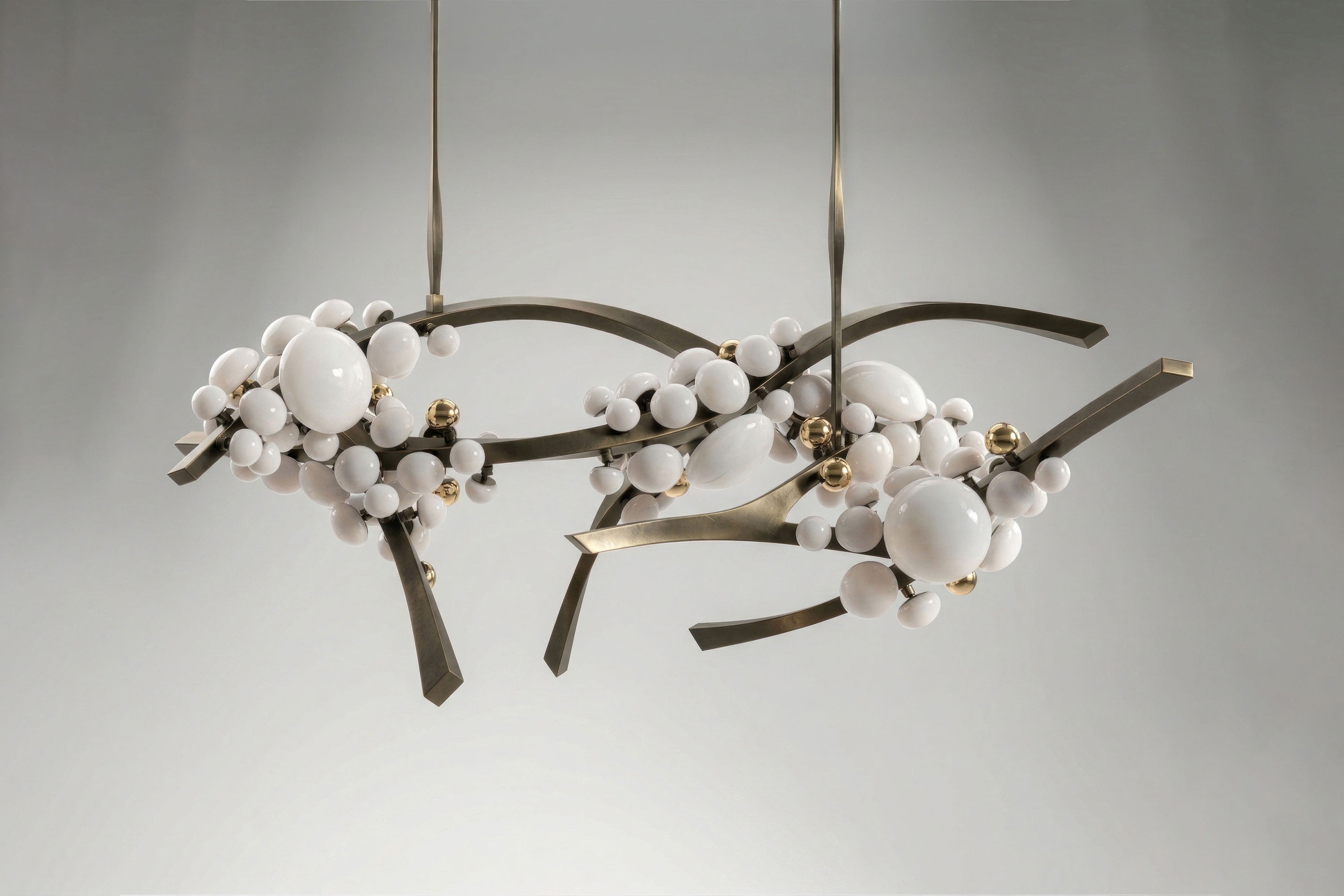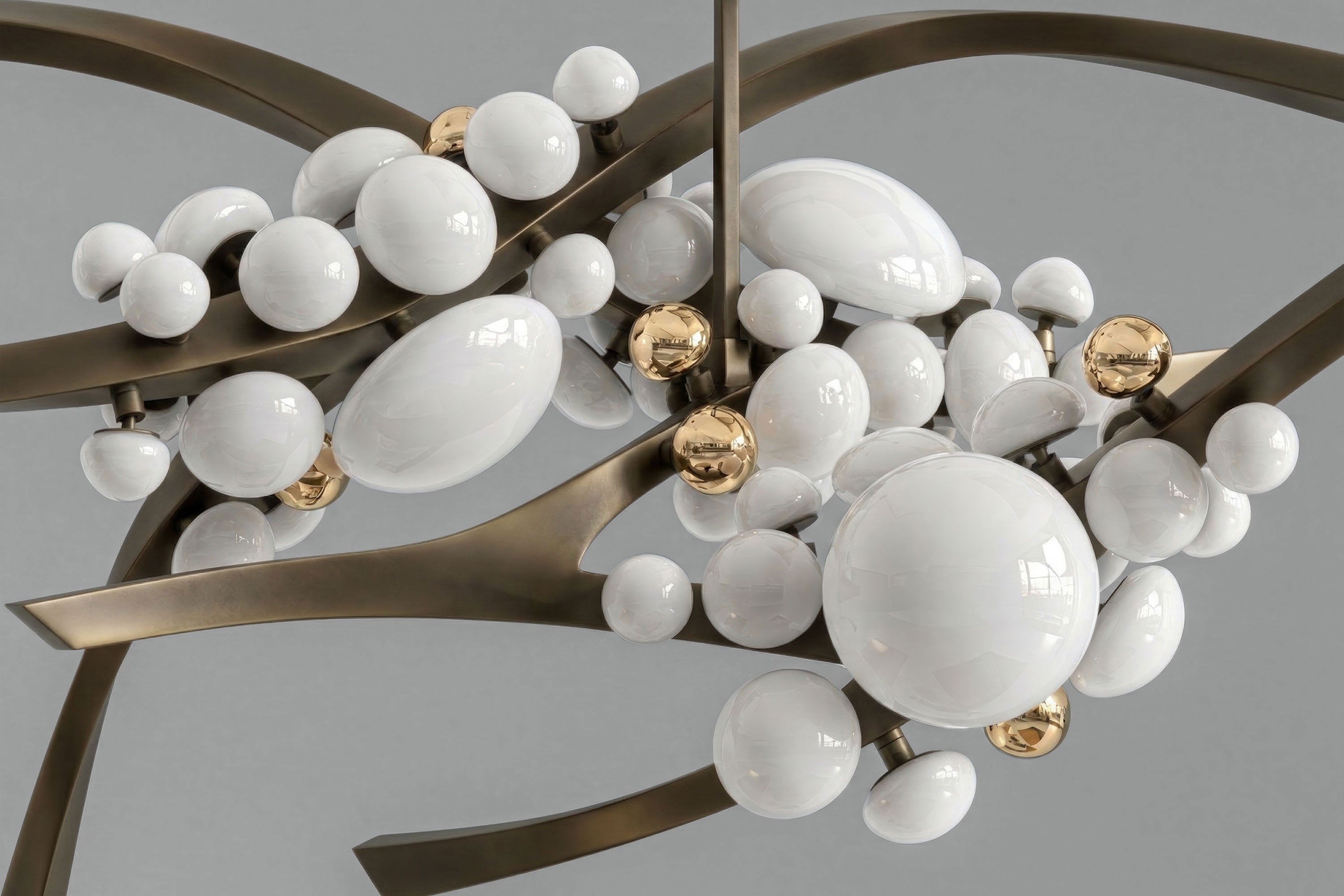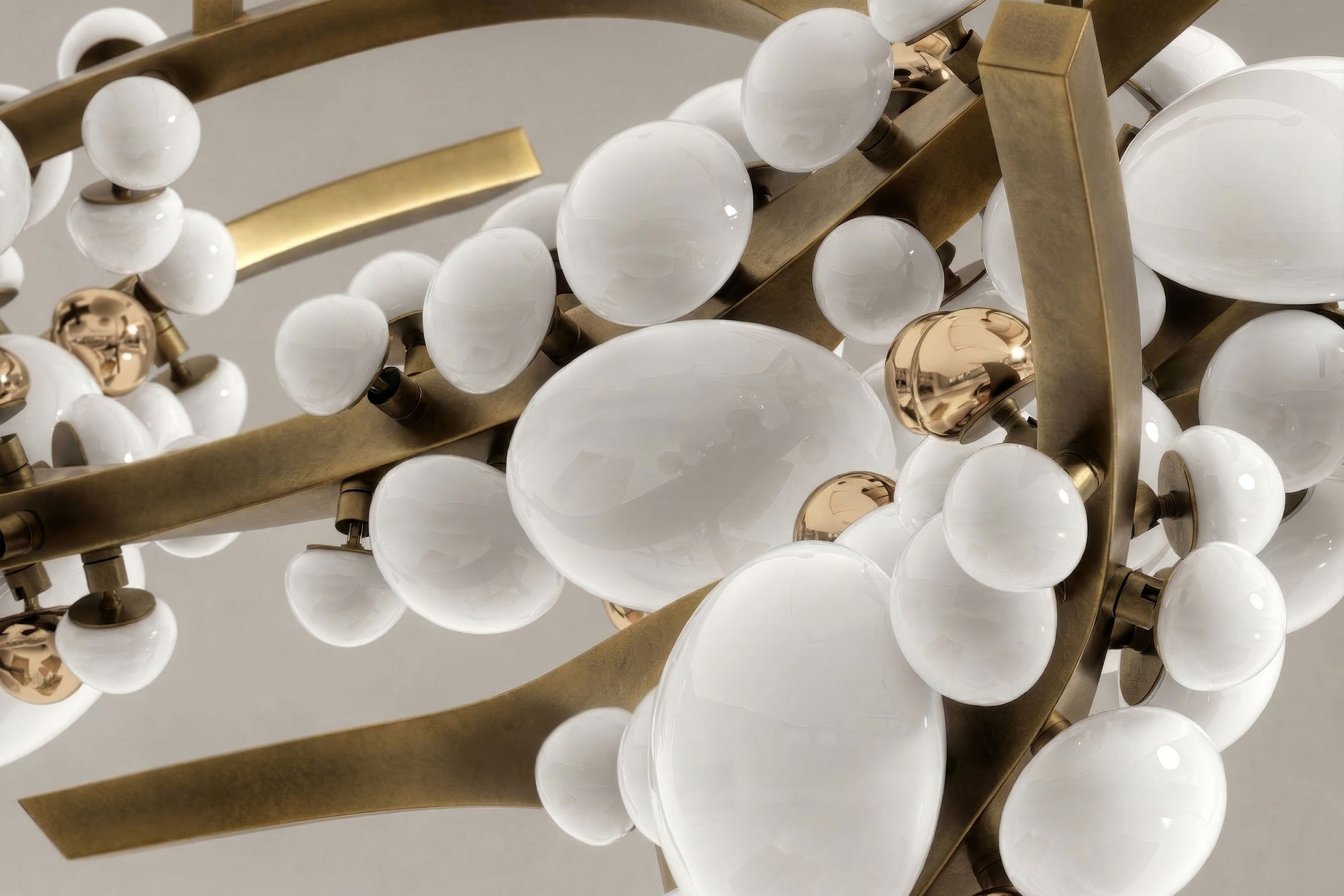 The undeniable soul of this piece lies in its exquisite Murano handmade glass globes. Crafted in varying, organic sizes, these pure milky diffusers resemble delicate blooms. Ingeniously designed, each glass bud can be twisted and turned to the perfect angle, allowing for a completely bespoke illumination experience. Supporting this radiant canopy is an intricate, branch-like frame masterfully forged from patina bronze. The rich, deep texture of the vintage-inspired metalwork provides a profound earthy contrast to the soft glass, ensuring the chandelier appears almost alive with organic movement.