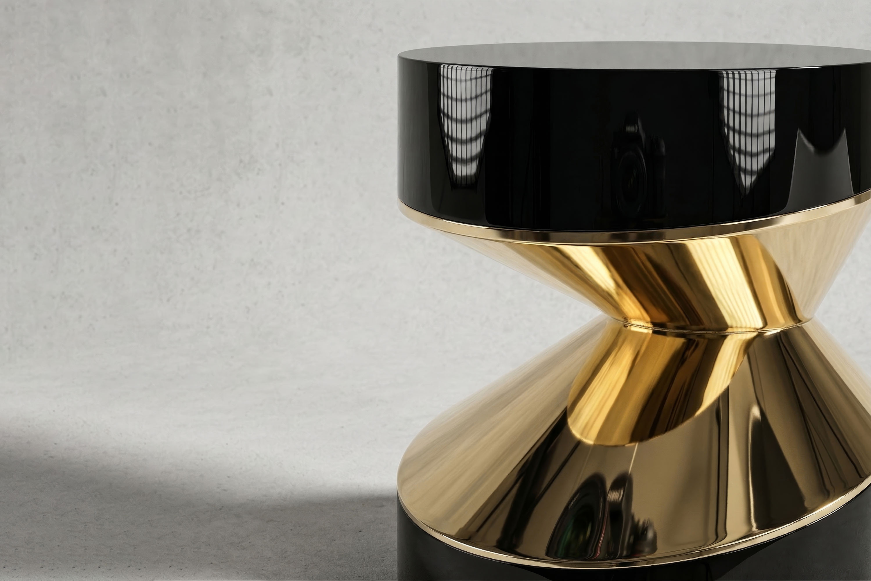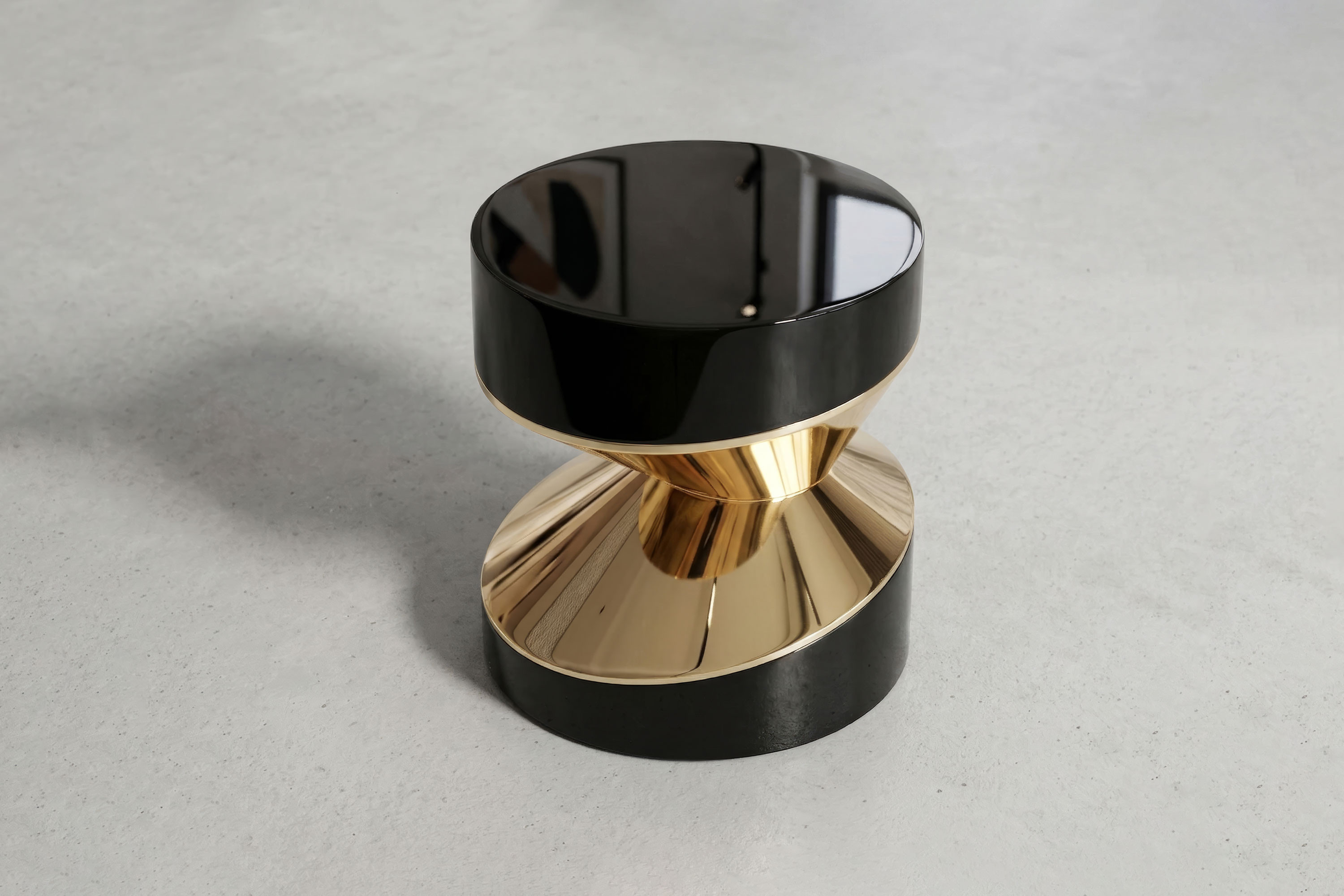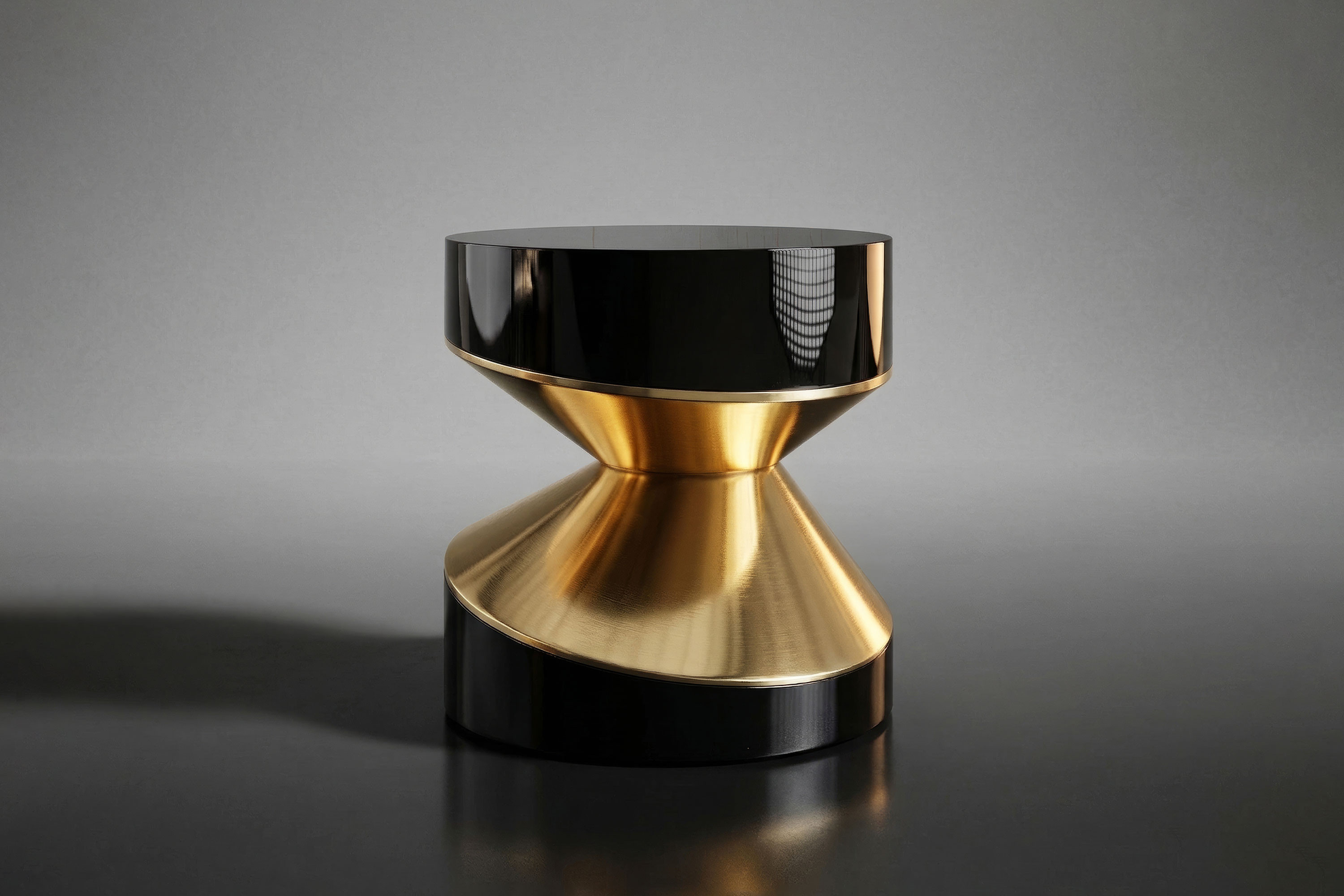 The composition executes a breathtaking dialogue of light and shadow. The piece is anchored by heavy, sweeping cylindrical tiers enveloped entirely in deep, highly reflective obsidian piano-lacquer. These pristine, liquid-mirror volumes create a severe, modern foundation that commands attention. Striking boldly through these dark tiers is a radiant structural bridge forged from high-polished bronze. This luminous metallic connector catches and refracts ambient light, creating a dynamic visual friction against the black lacquer and transforming the table into a definitive statement of contemporary luxury.