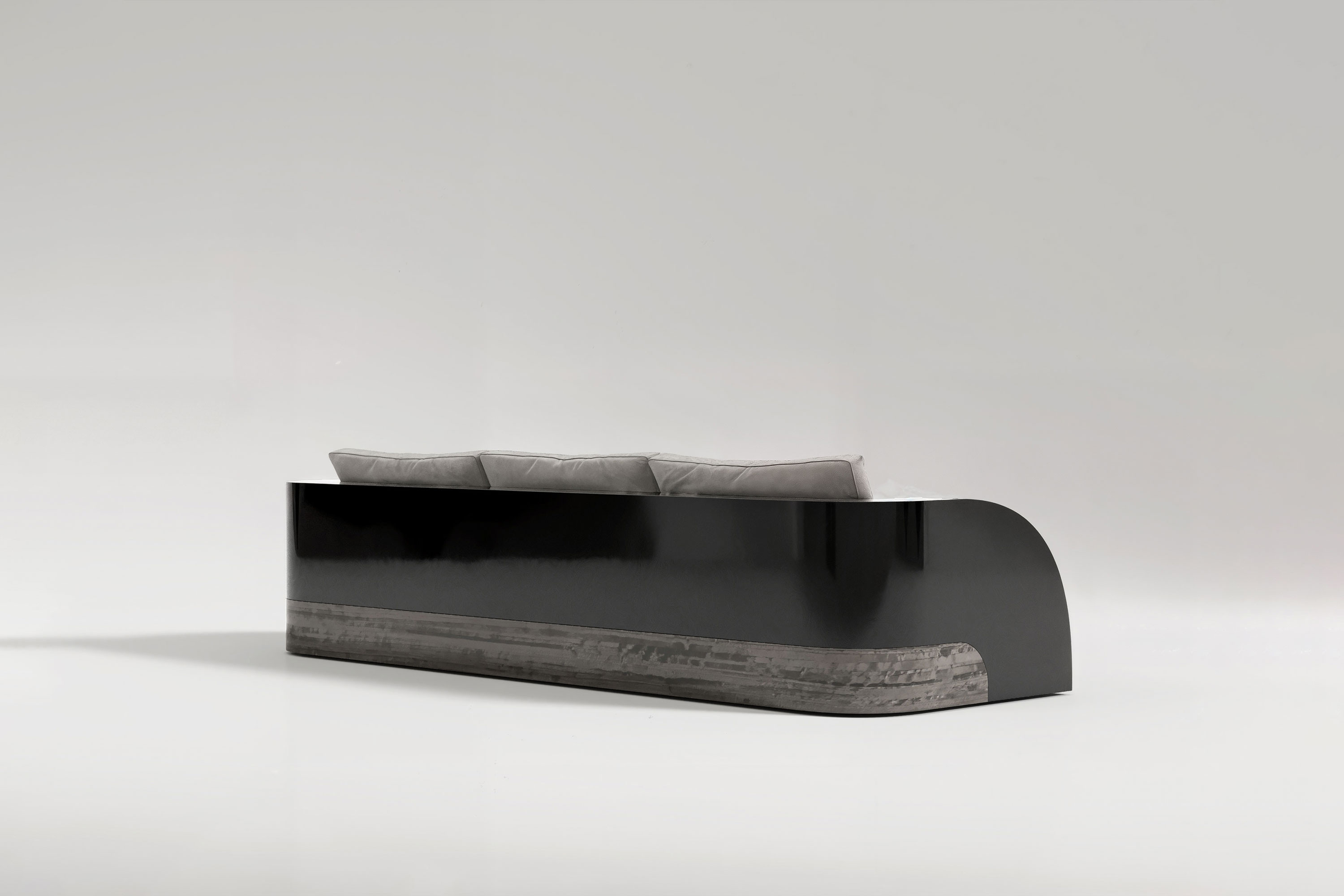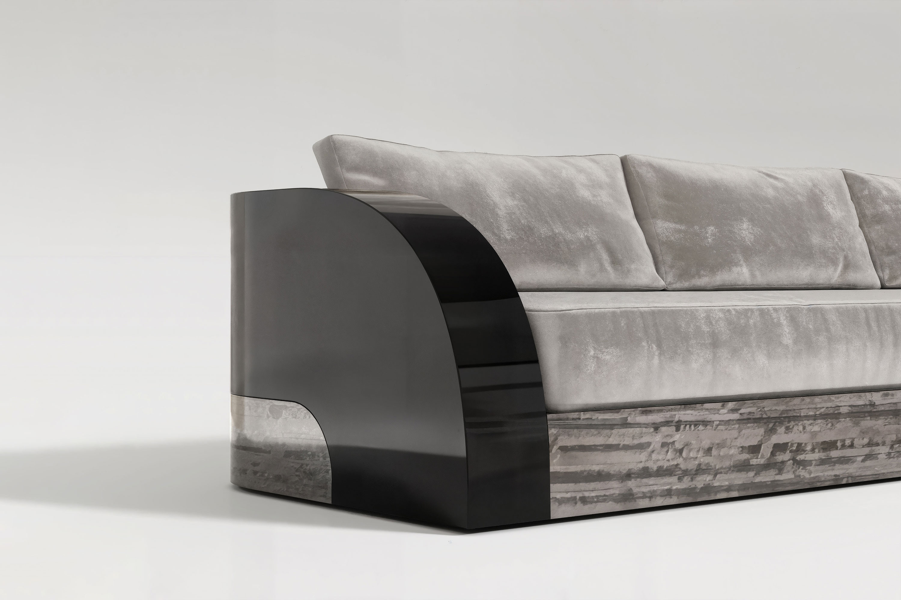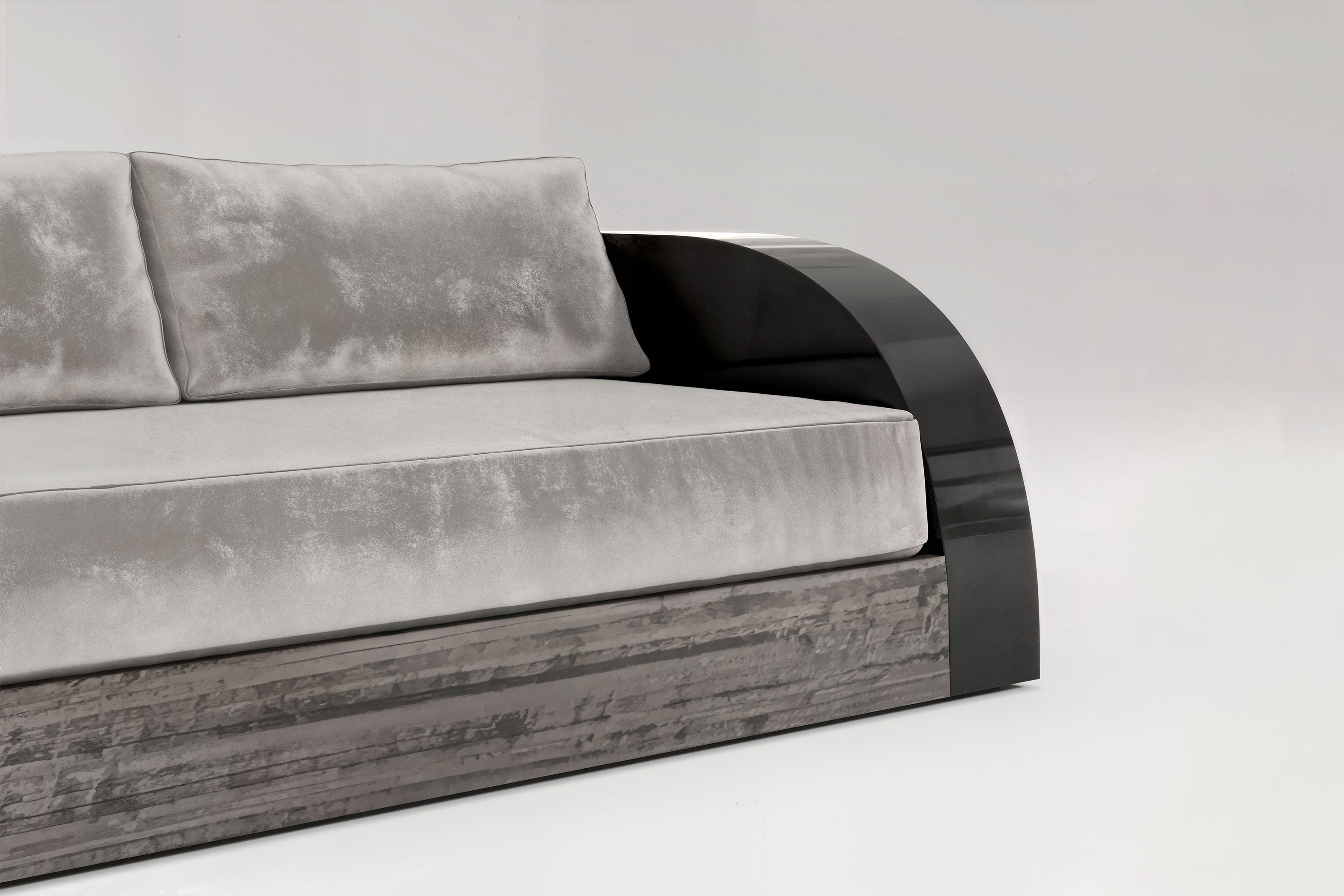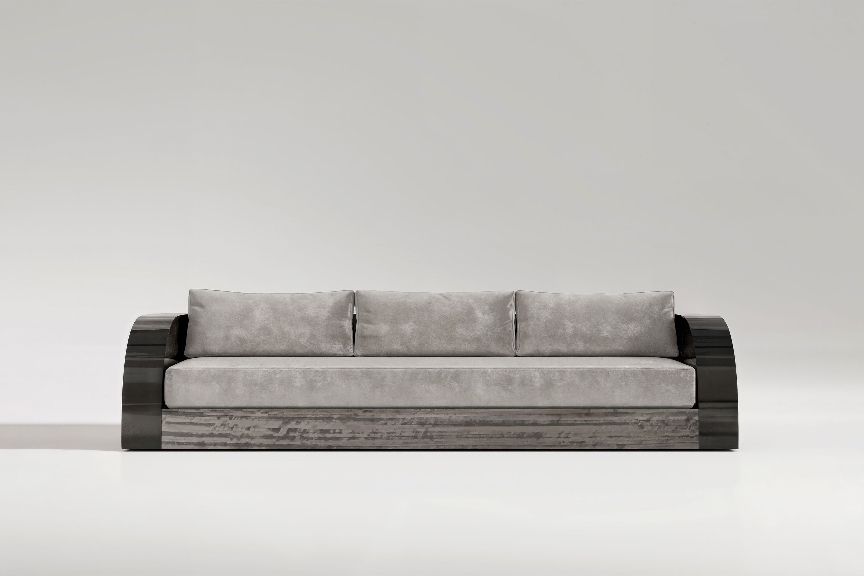 This edition explores a striking dialogue of dramatic textures and moody elegance. The foundation is masterfully crafted from premium Eucalyptus veneer, its bold, intricate grain physically grounding the piece with a highly refined, extravagant energy. Rising from this organic base is a sleek, highly reflective black lacquer frame that encases the piece in severe modernism. Contrasting this rigid exterior is the voluminous seating area, defined by gracefully rounded arms and plush, luxurious upholstery designed for unparalleled comfort and aesthetic harmony. It is a true masterpiece that effortless transforms the living room into a curated sanctuary.