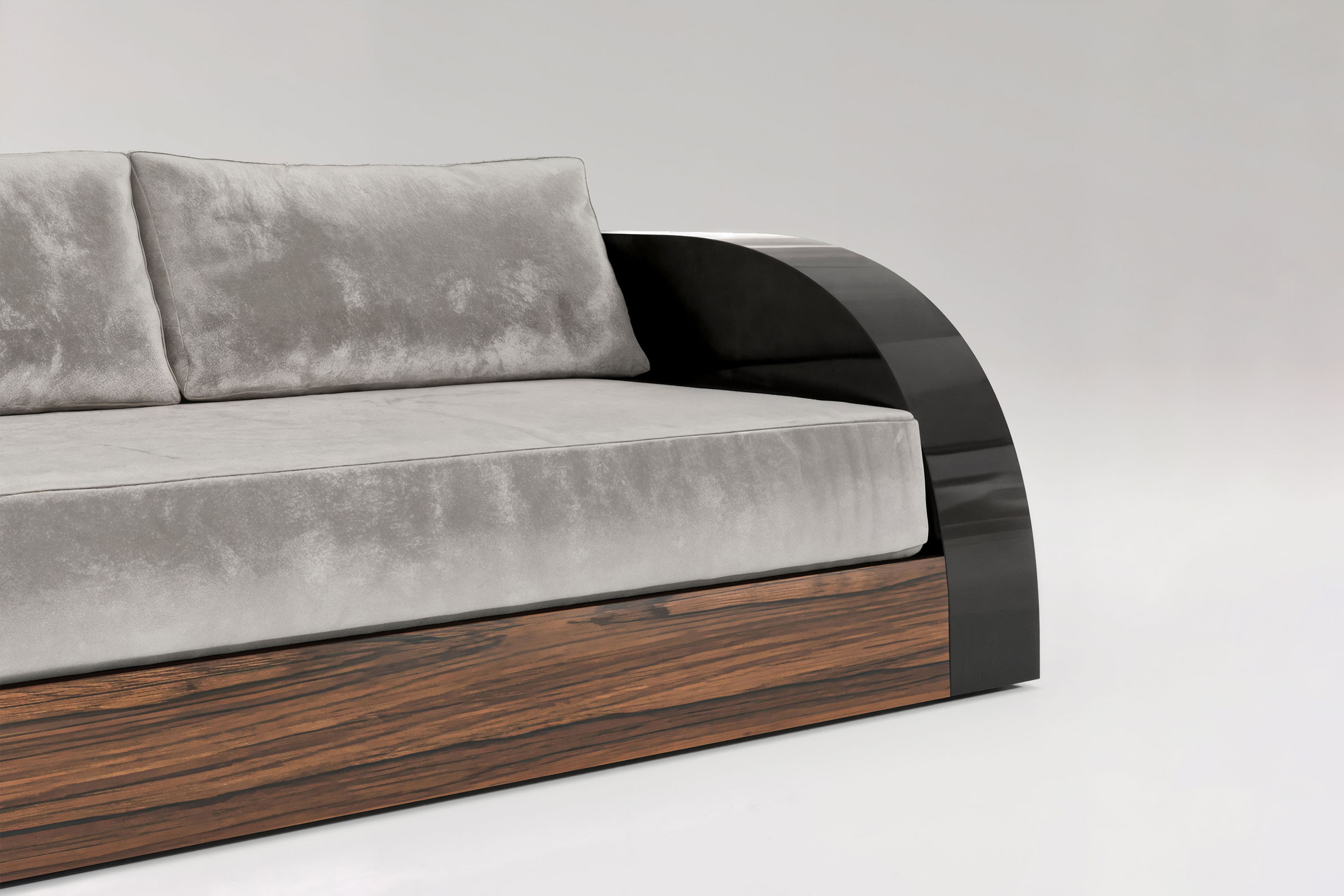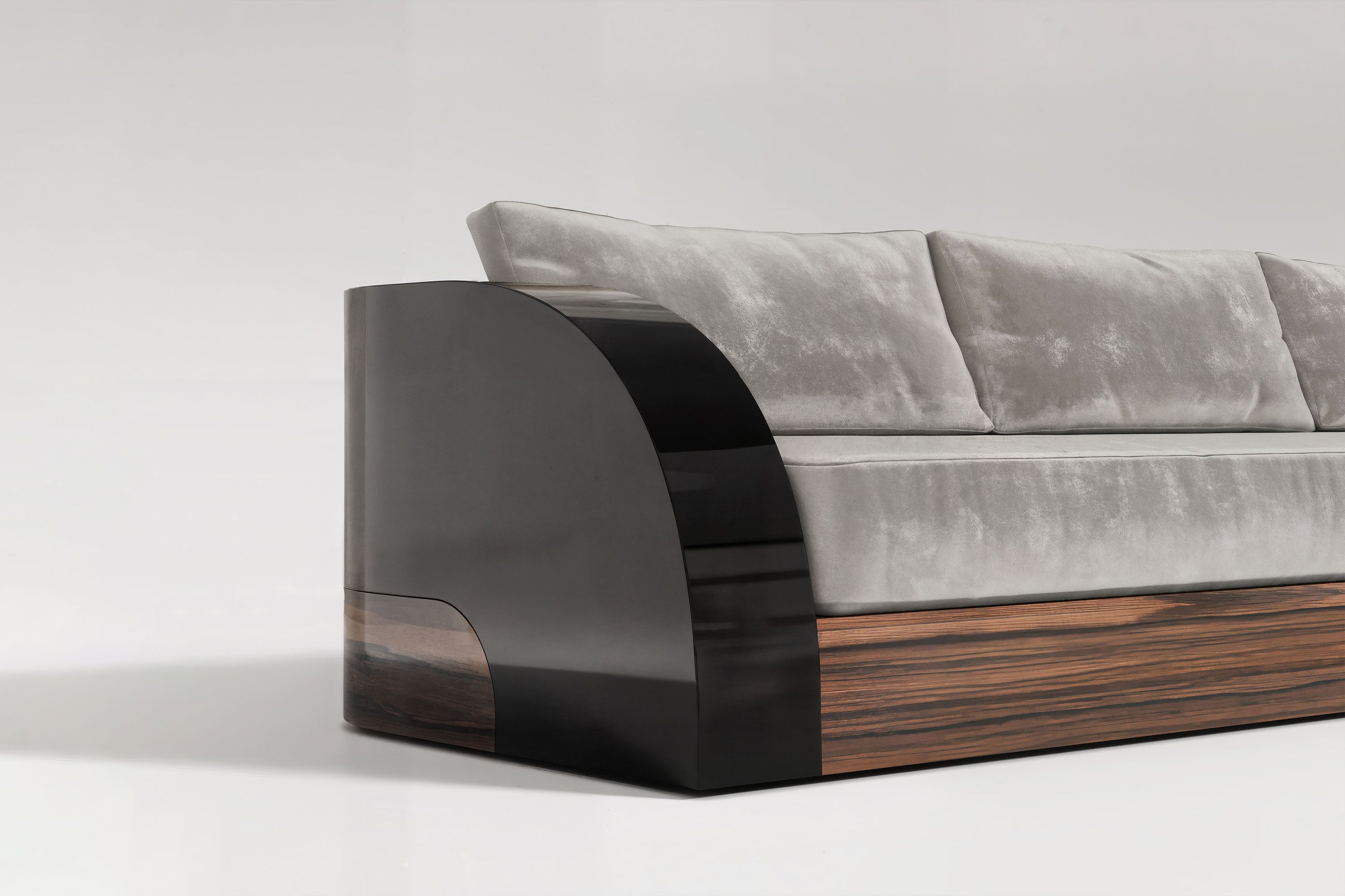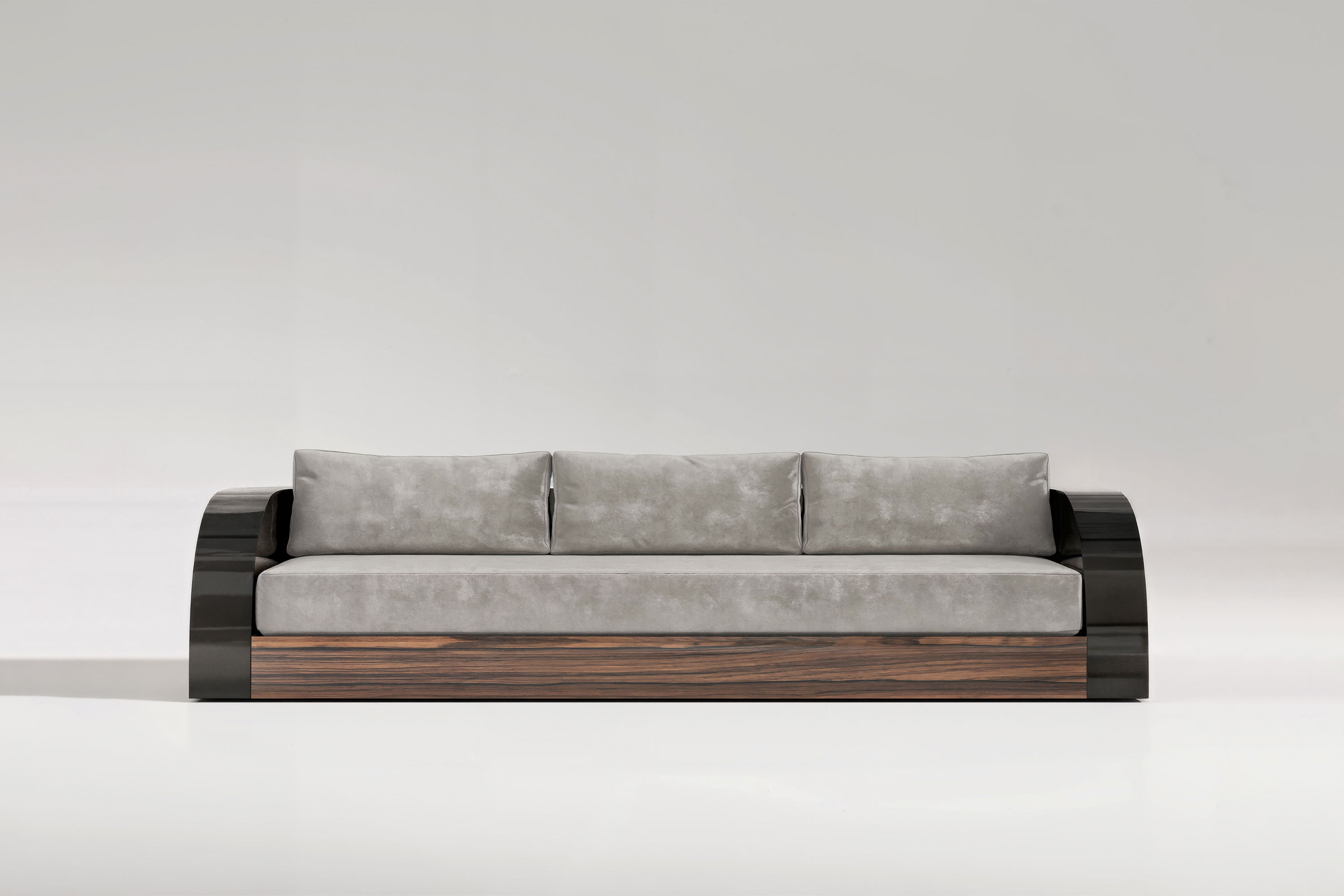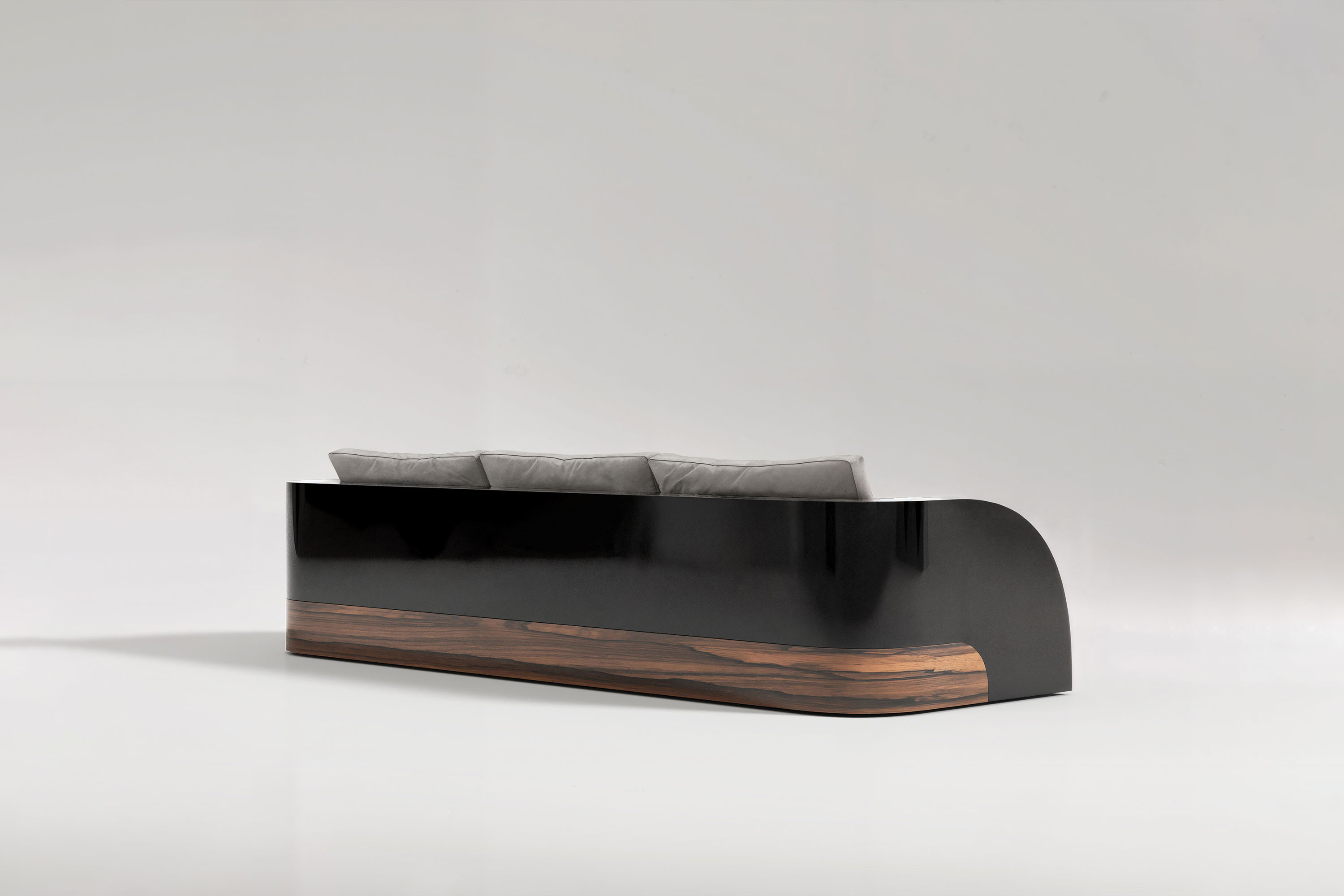 This edition executes a breathtaking dialogue of rich materials and profound warmth. The sofa rests upon a meticulously crafted foundation of premium American walnut, introducing an earthy elegance that grounds the entire room. Rising from this natural base is a sleek, highly reflective black lacquer frame that encases the piece in severe modernism. Contrasting this rigid architectural shell is the voluminous seating area, featuring uniquely rounded arms and plush, premium upholstery that promises an immersive, uncompromising comfort. It is an extraordinary fusion of high-end joinery and soft, inviting luxury.