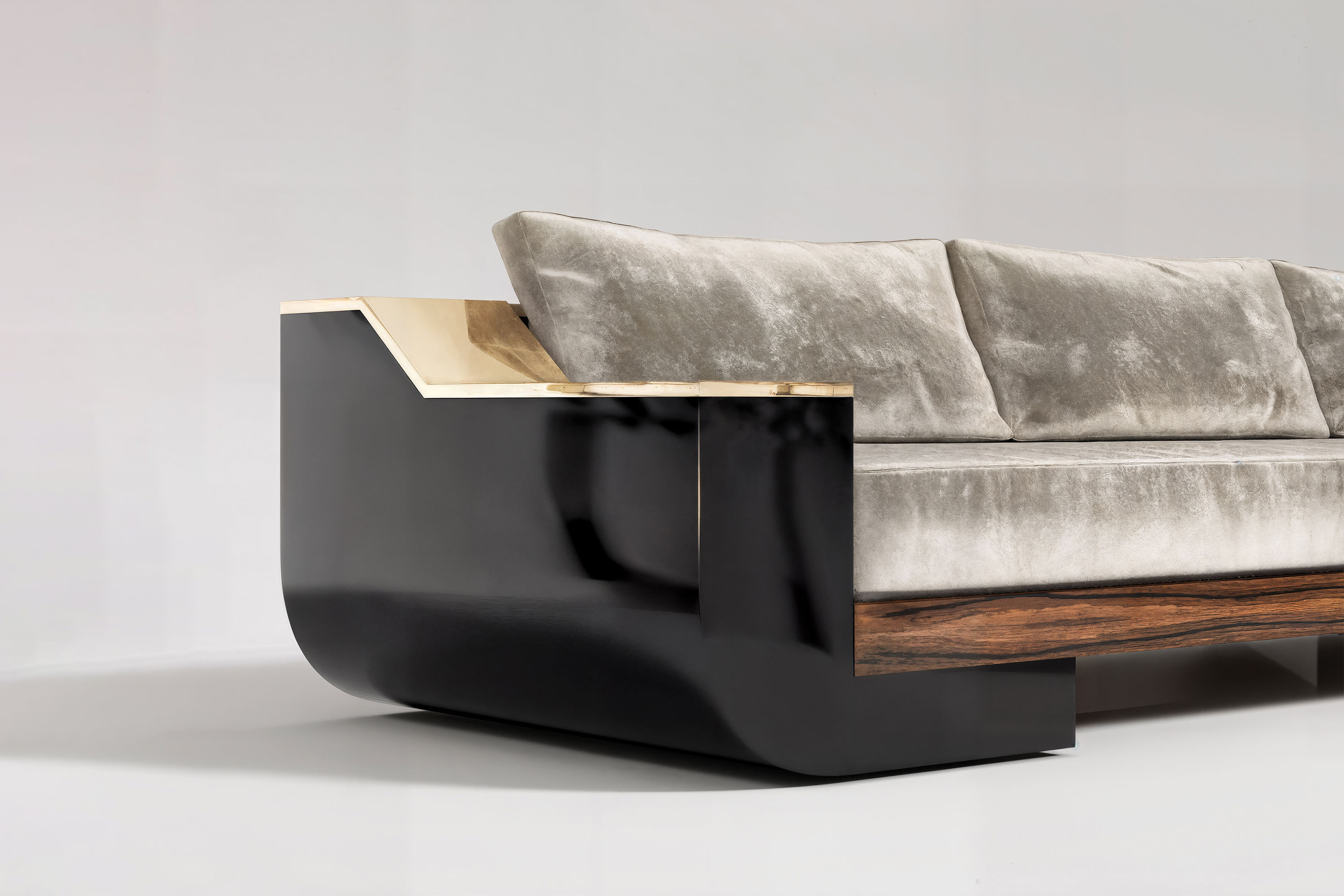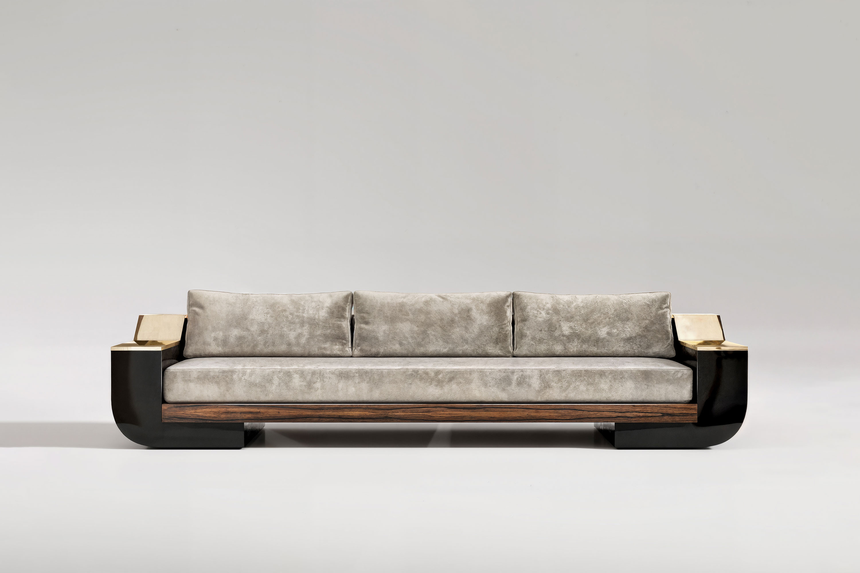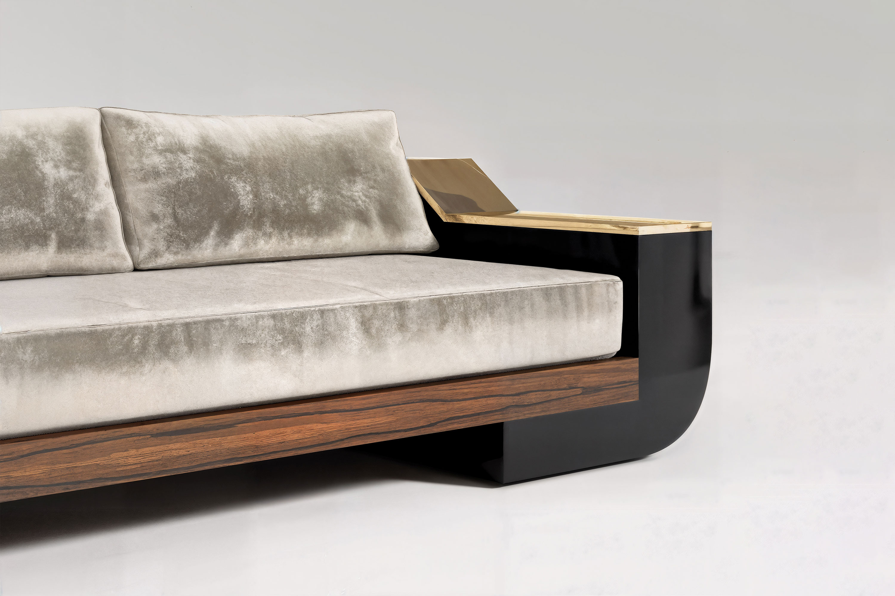 The composition executes a breathtaking dialogue of opulent materials and tailored design. The sofa rests upon a substantial, meticulously crafted walnut base, introducing a profound, earthy warmth that grounds the entire piece. Rising from this organic foundation is a sleek, polished lacquer frame, gracefully accented by intricate, high-polished bronze detailing that catches and refracts ambient light.