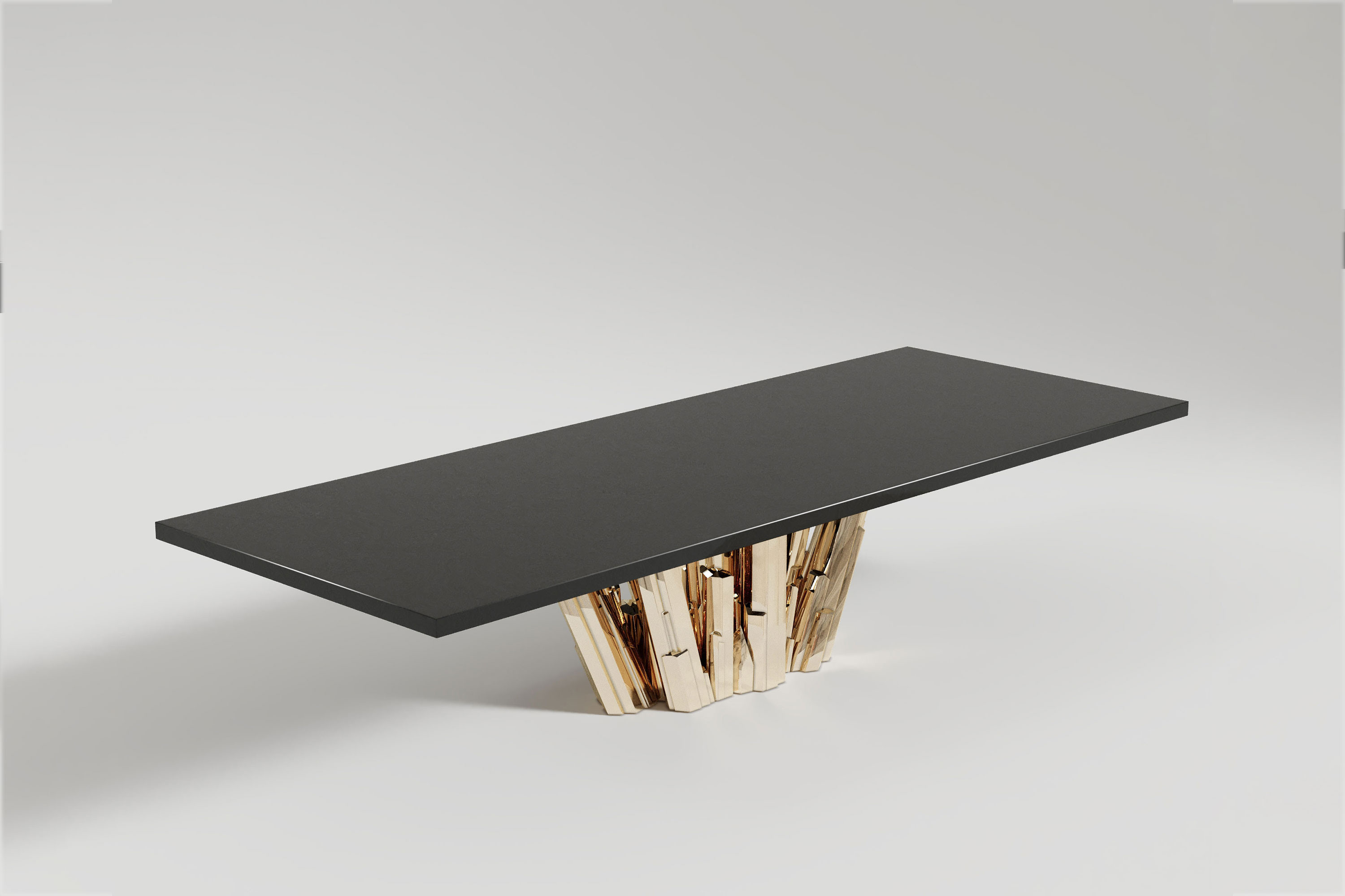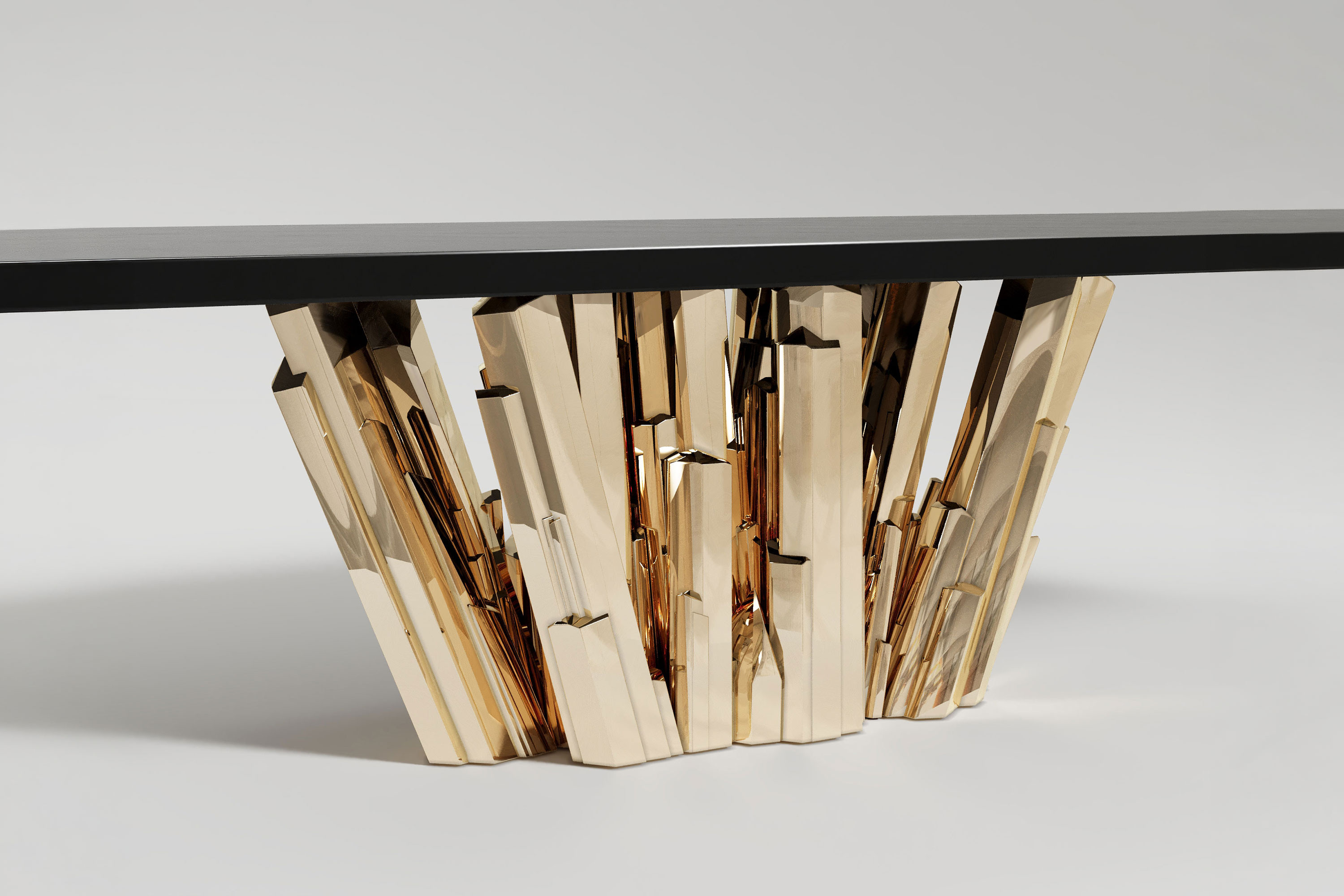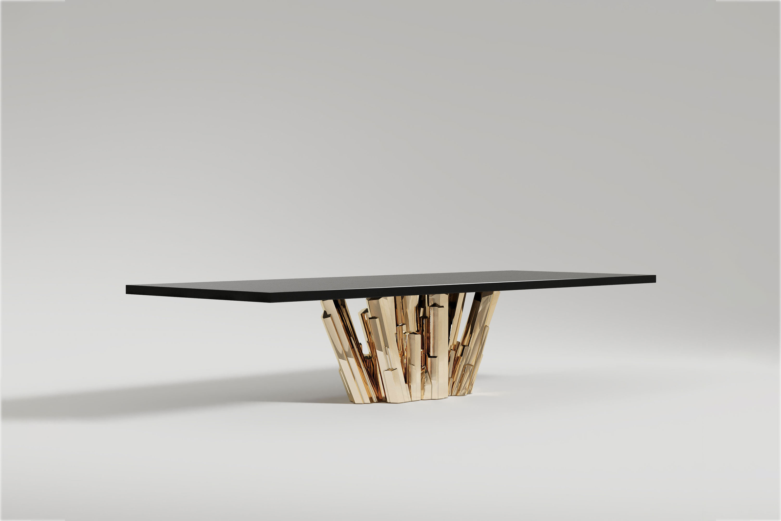 The design executes a breathtaking dialogue of material opposites. The table features a severe, horizontal expanse finished in a deep, highly reflective obsidian piano-lacquer. This flawless, heavy liquid-mirror horizon is brilliantly supported by an explosive, sculptural pedestal. Handcrafted from clustered geometric shards of high-polished bronze, the complex base catches and refracts ambient light in every direction. The striking visual friction between the quiet, minimalist stillness of the dark tabletop and the dynamic, luminous energy of the metallic base transforms every gathering into an exhibition of high-end design.