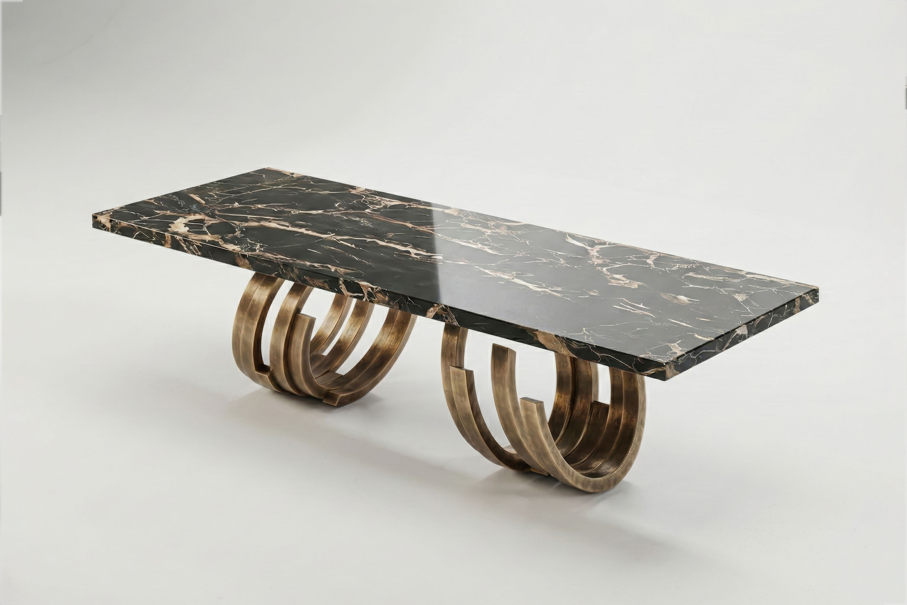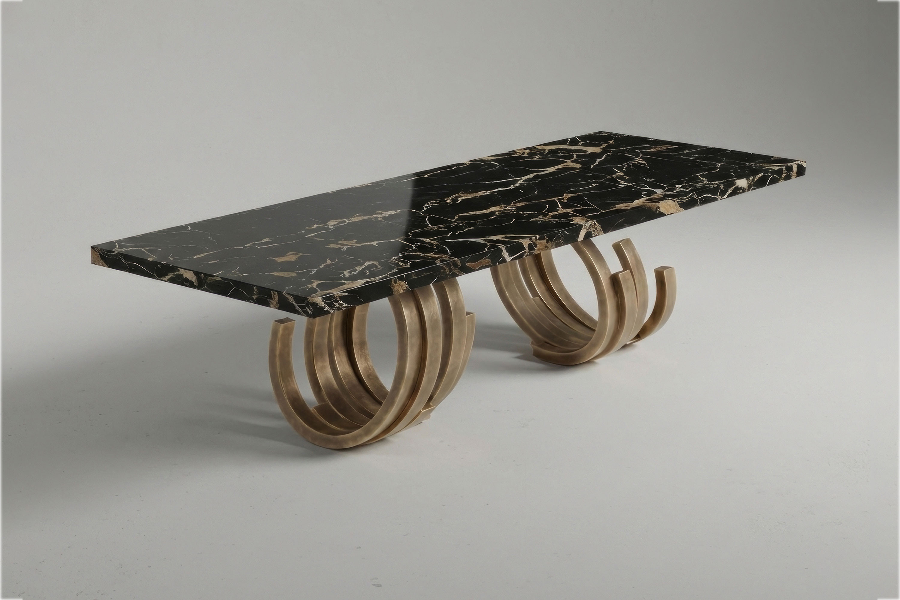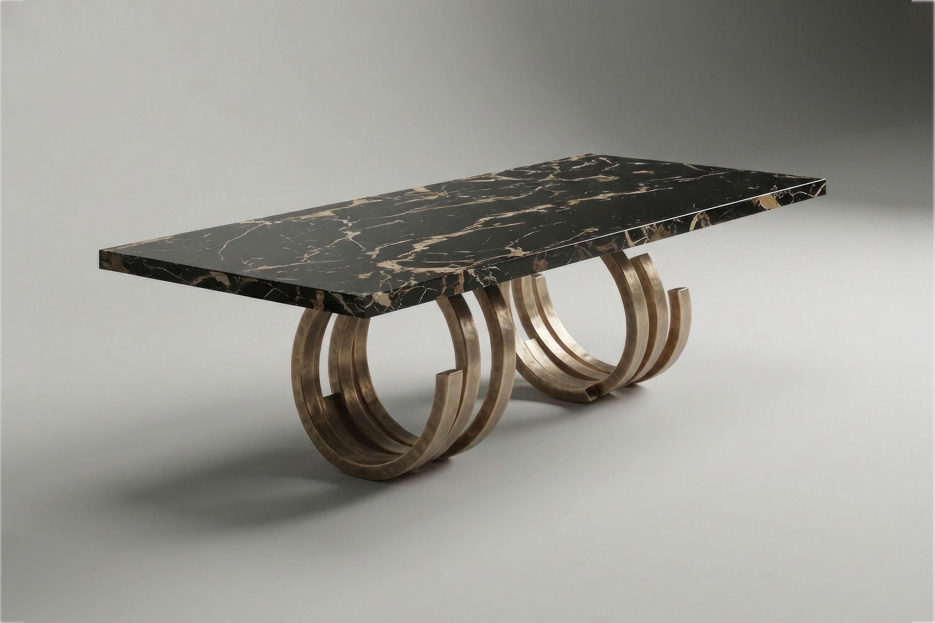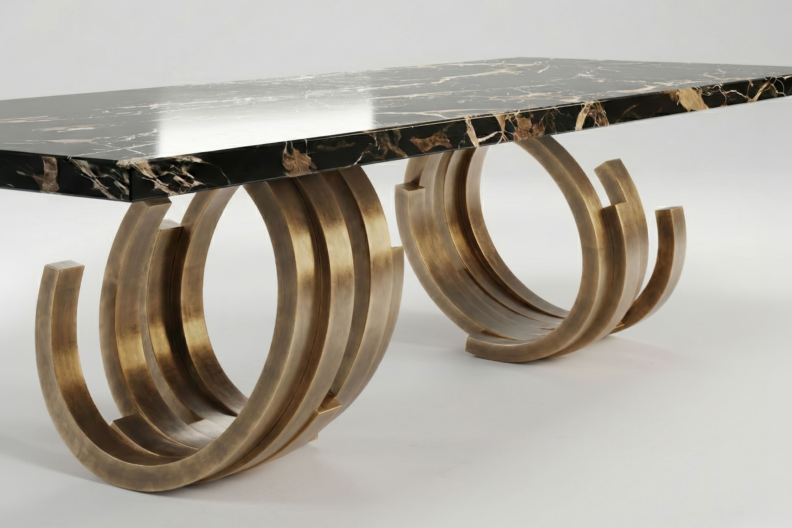 This edition explores a breathtaking dialogue of raw texture and dramatic opulence. The foundational structure is forged from textured patina bronze, its deep, light-absorbing finish physically grounding the piece with an enduring, earthy heritage. Resting gracefully atop this robust metallic base is a spectacular circular expanse of Nero Portoro marble. Characterized by its deep black background and sweeping, chaotic veins of gold and white, the natural stone introduces a powerful organic energy to the room. The striking visual tension between the vintage charm of the bronze and the untamed elegance of the marble transforms every dining experience into an exhibition of high-end design.