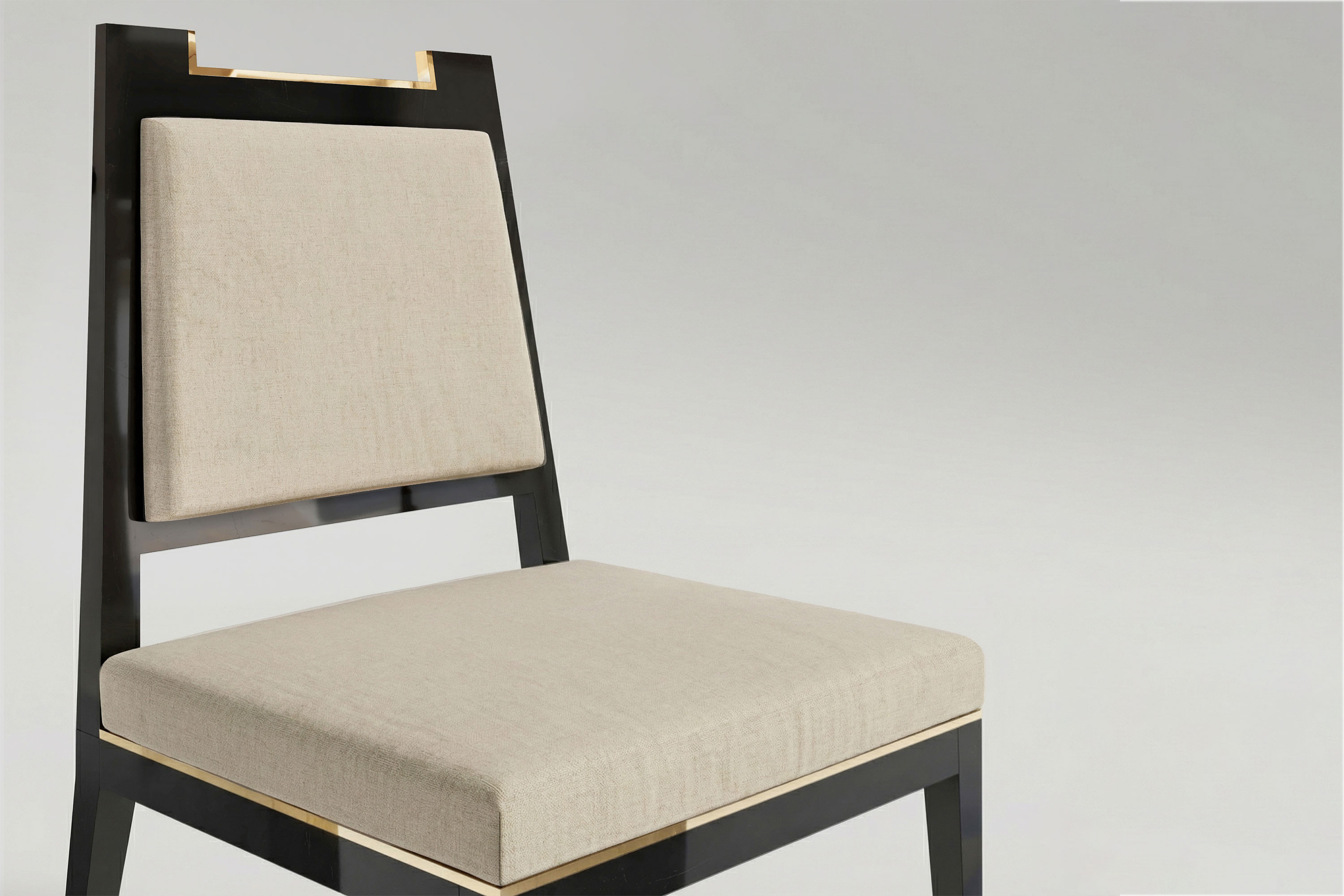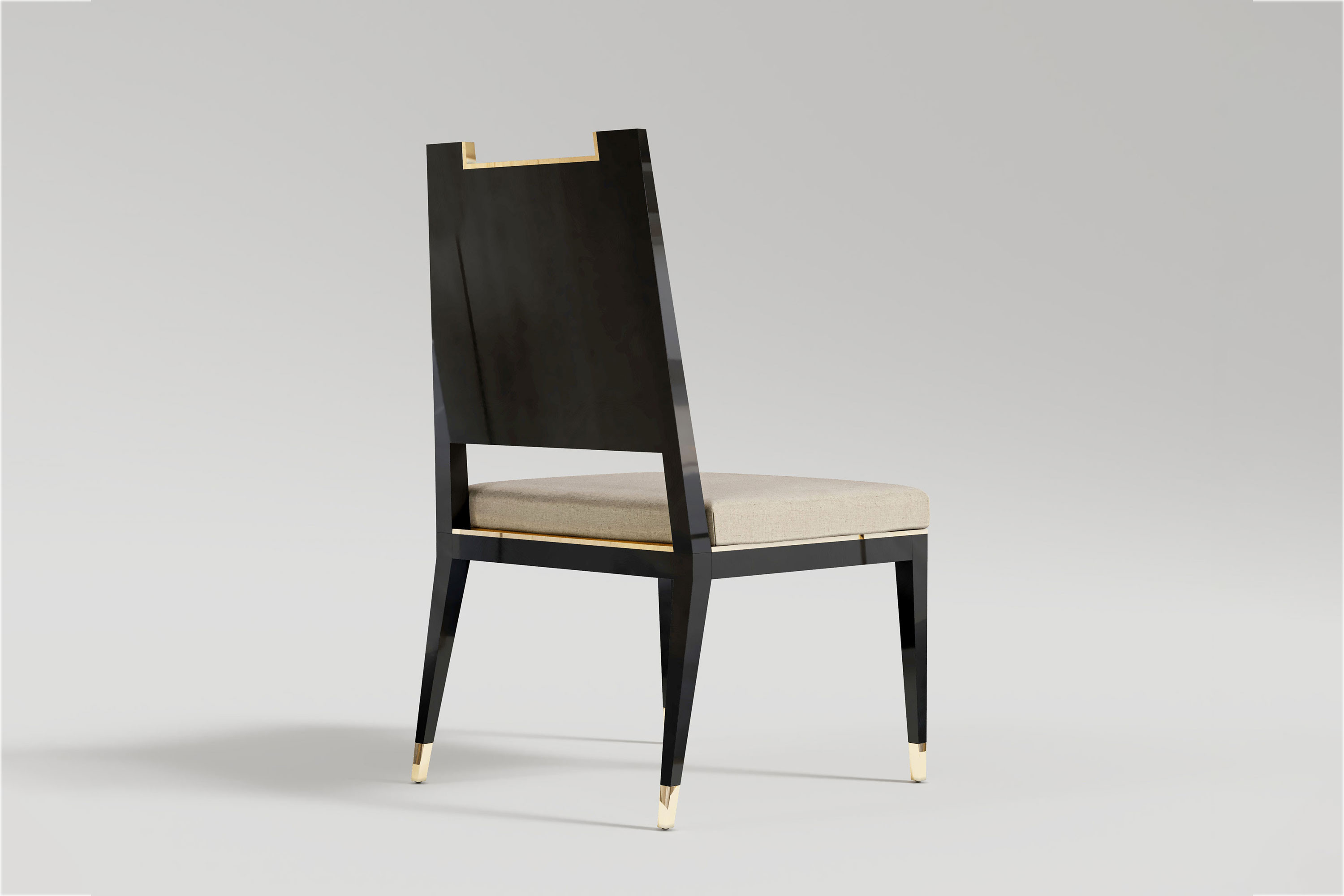 The rigid frame is enveloped in a high-polished obsidian lacquer, establishing a striking visual weight. This darkness is meticulously punctuated by hand-polished bronze accents, from the commanding structural crown to the bespoke sabots capping each leg creating a warm, golden resonance against the deep finish. Beneath the precisely tailored upholstery lies a premium cushioning system engineered for sustained support, flawlessly uniting dramatic verticality with profound physical ease.