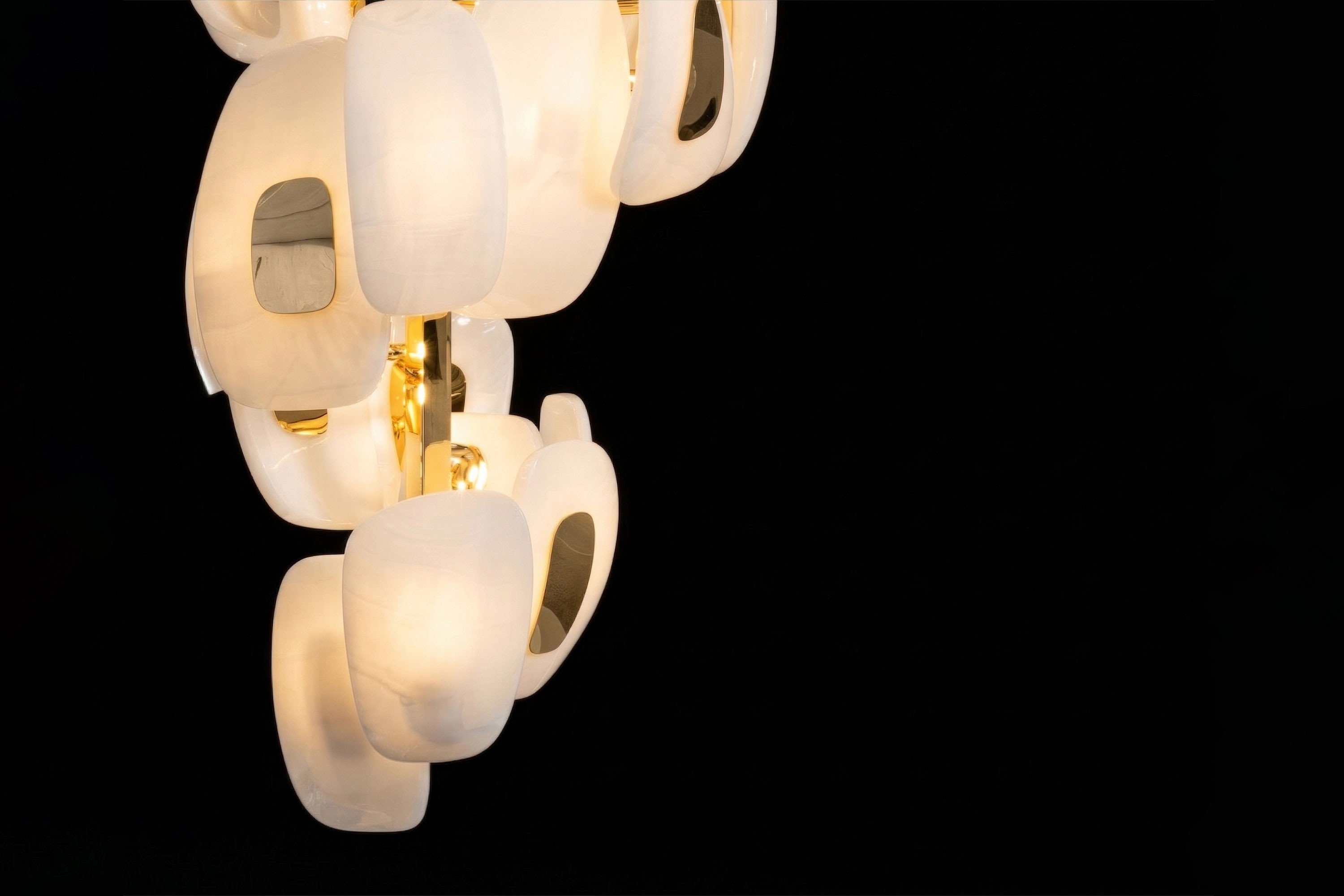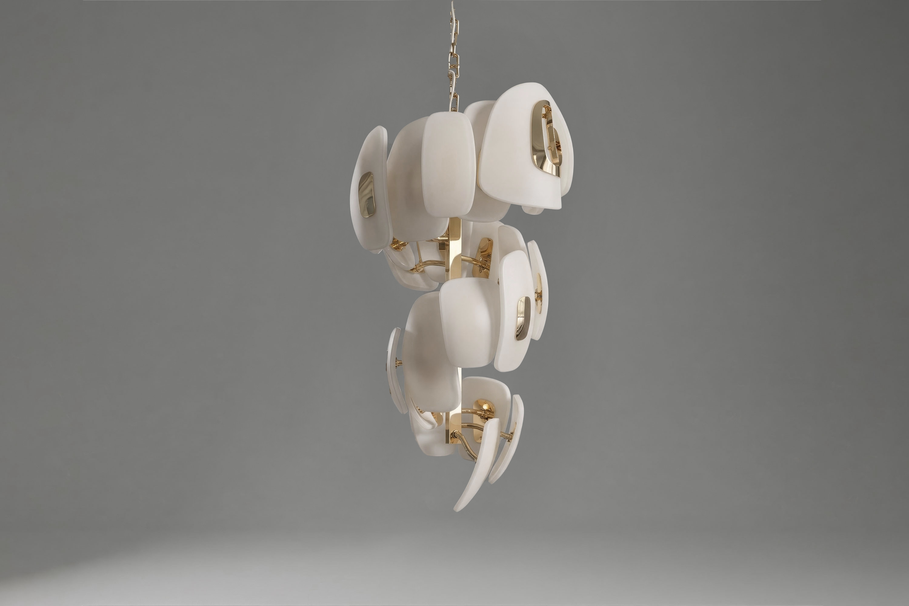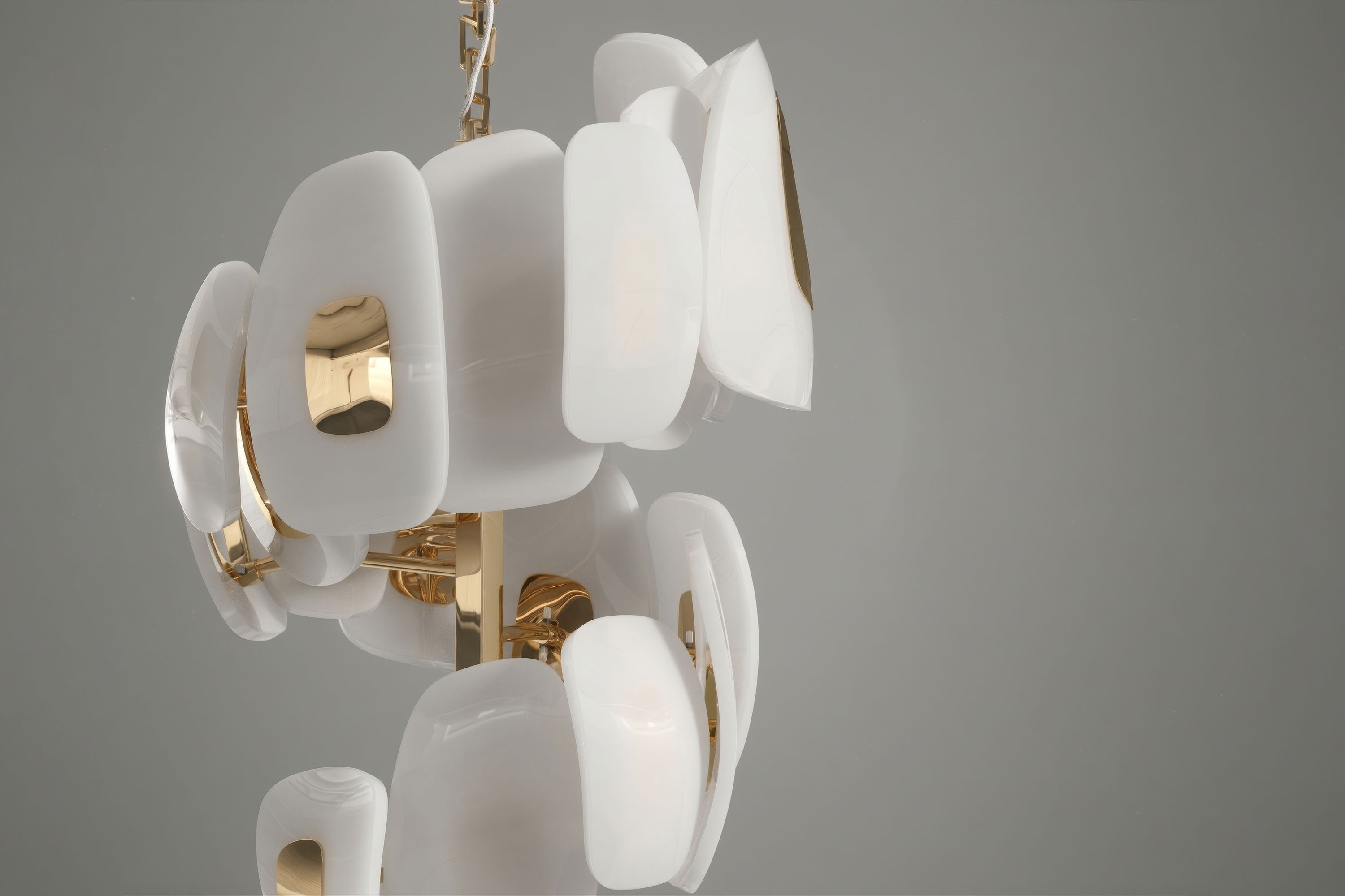 The undeniable soul of this masterpiece lies in its pure, milky Murano handmade glass diffusers. As they spiral gracefully downward, these sleek, wing-like shades cast a soft, perfectly even glow, creating an ethereal and inviting ambiance throughout the room. Cradling these luminous wings is a dynamic architectural frame masterfully crafted from high-polished bronze. Its radiant metallic surface catches ambient light from every angle of the cascade, anchoring the airy design with opulent luxury and elevating the chandelier into a true work of bespoke functional art.