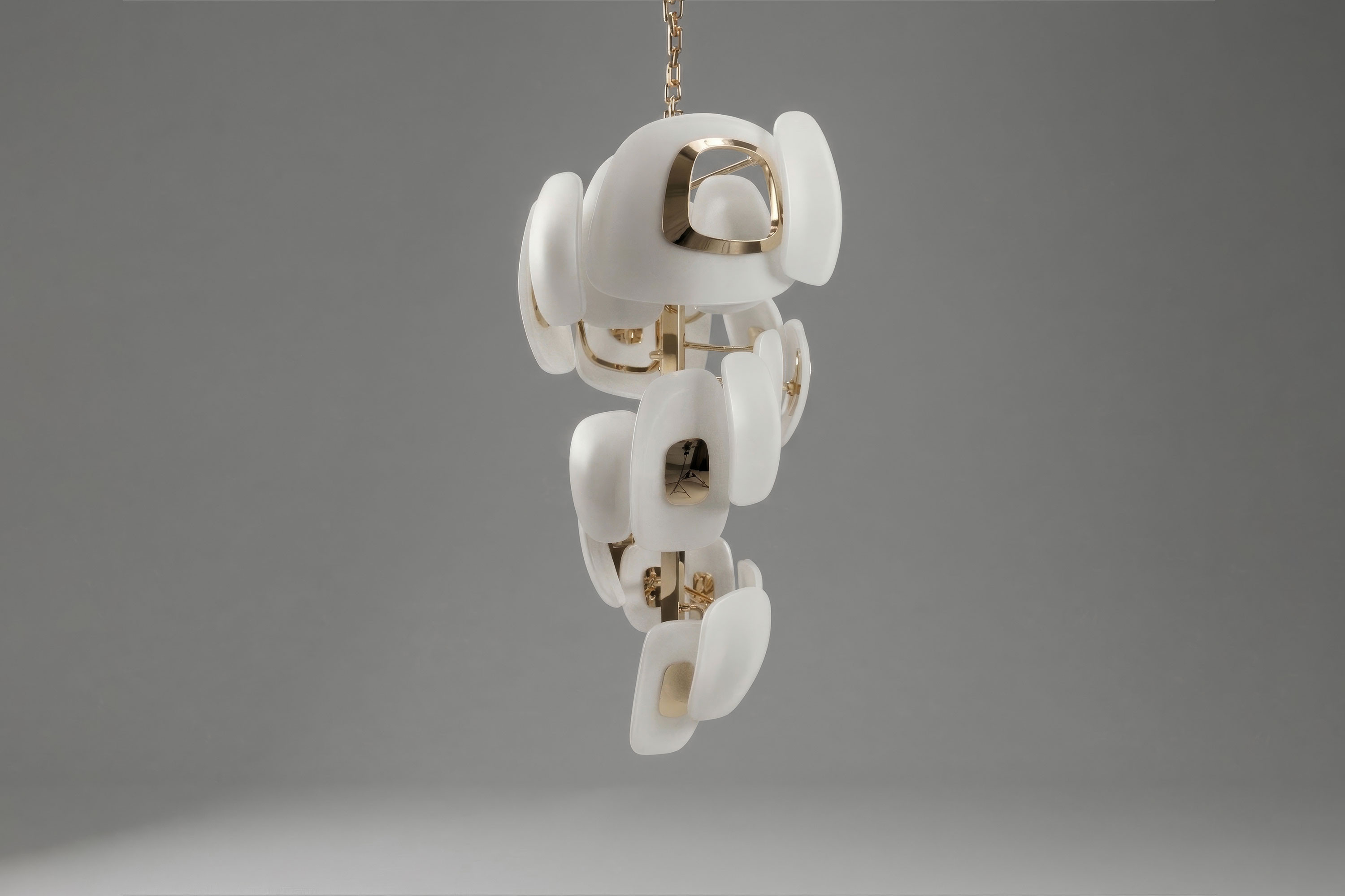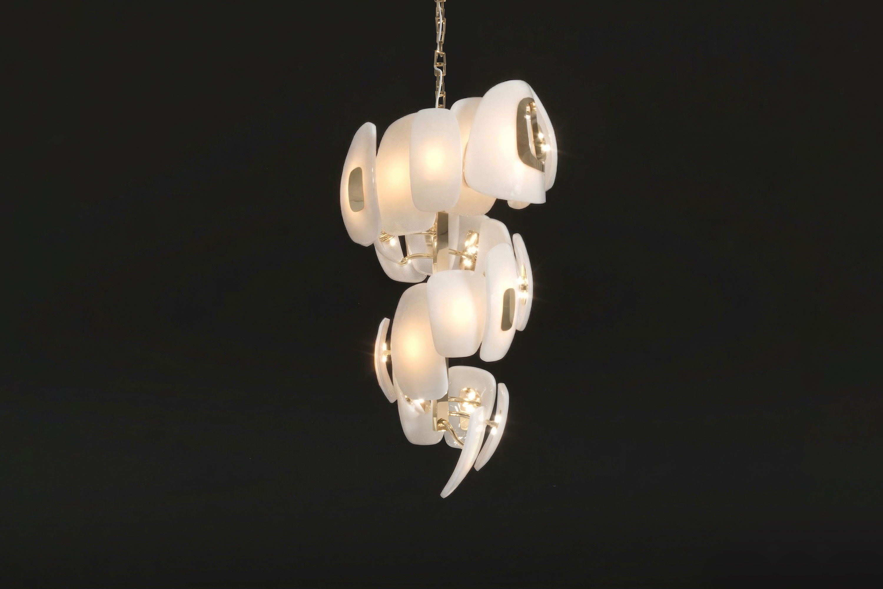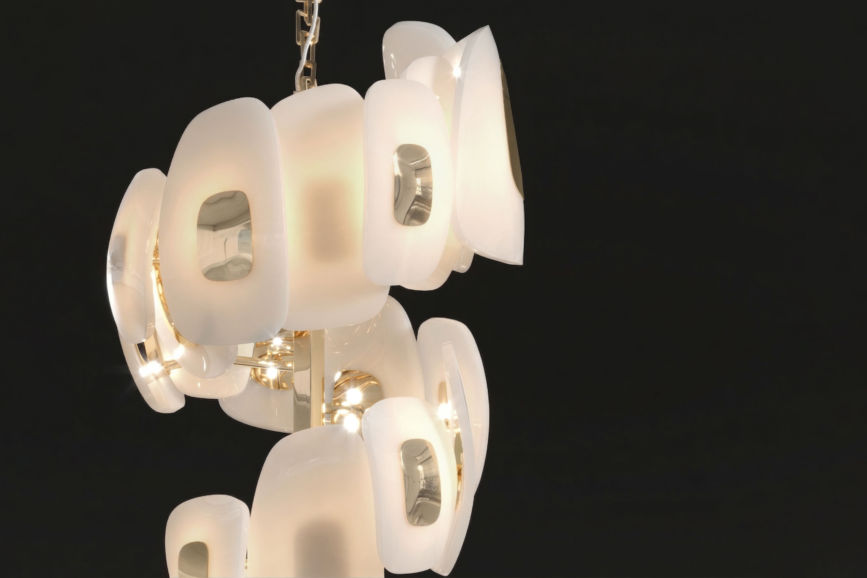 The undeniable soul of this masterpiece lies in its pure, milky Murano handmade glass diffusers. As they spiral gracefully downward, these sleek, wing-like shades cast a soft, perfectly even glow, creating an ethereal and inviting ambiance throughout the room. Cradling these luminous wings is a dynamic architectural frame masterfully crafted from high-polished bronze. Its radiant metallic surface catches ambient light from every angle of the cascade, anchoring the airy design with opulent luxury and elevating the chandelier into a true work of bespoke functional art.