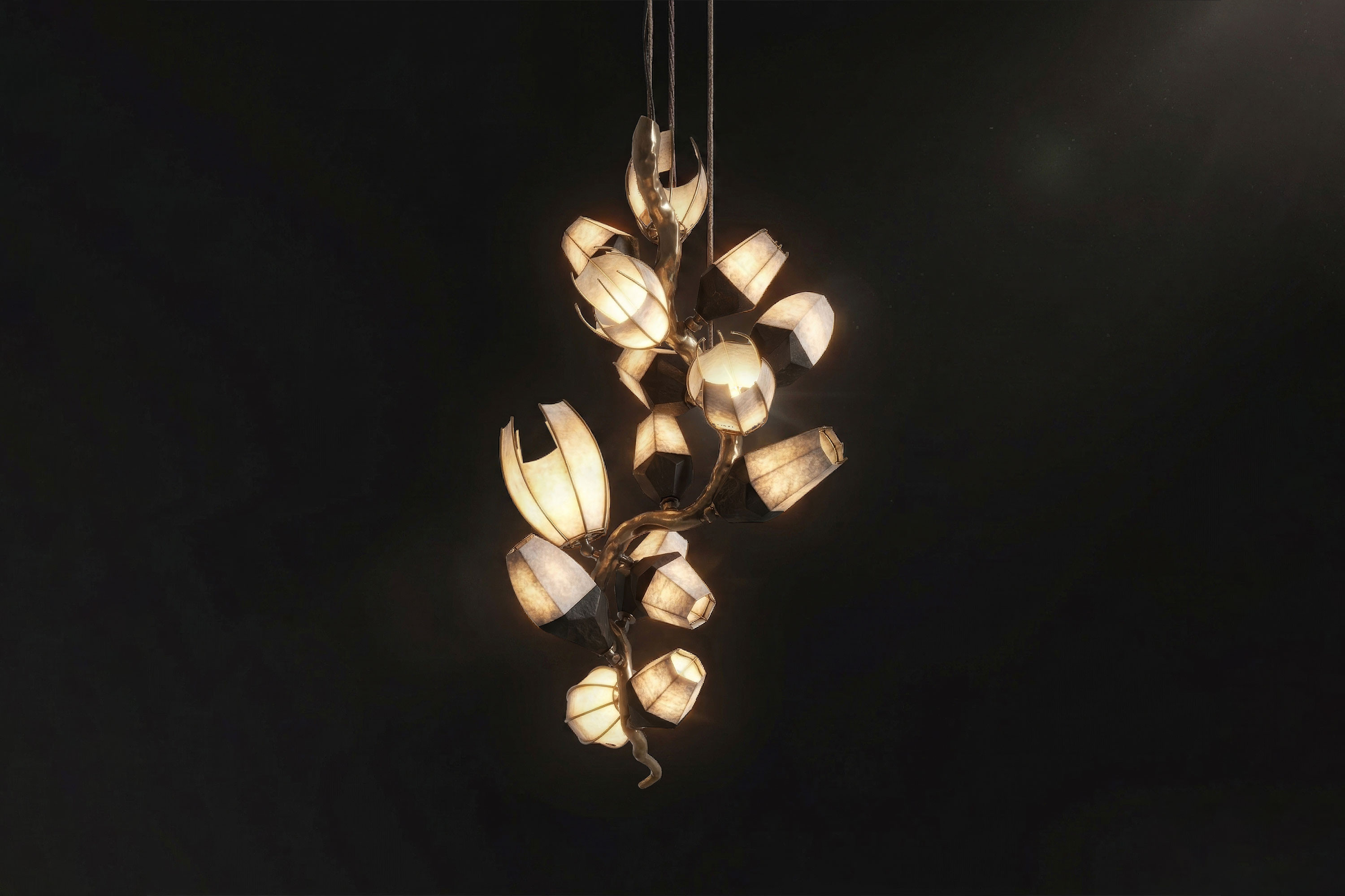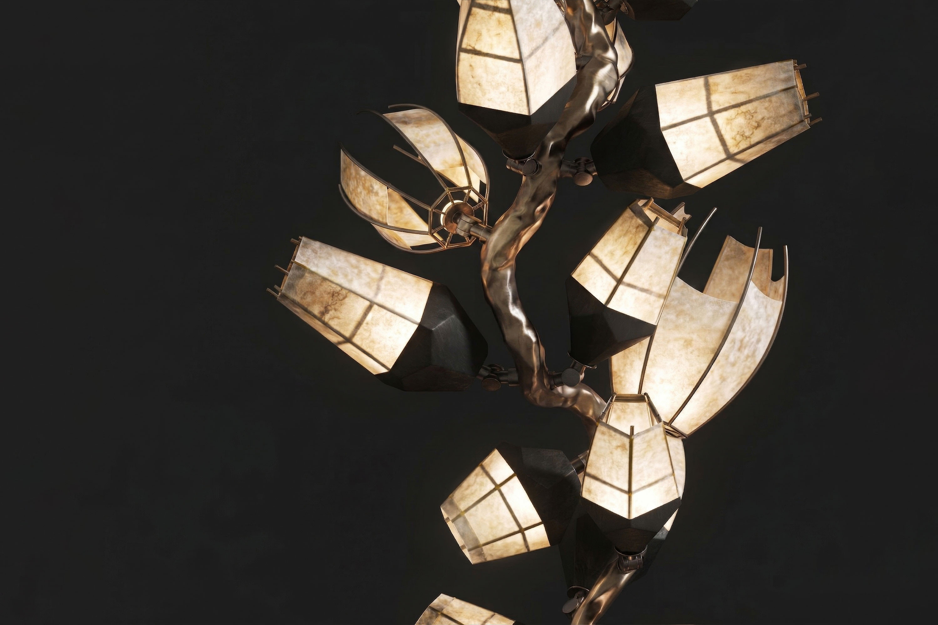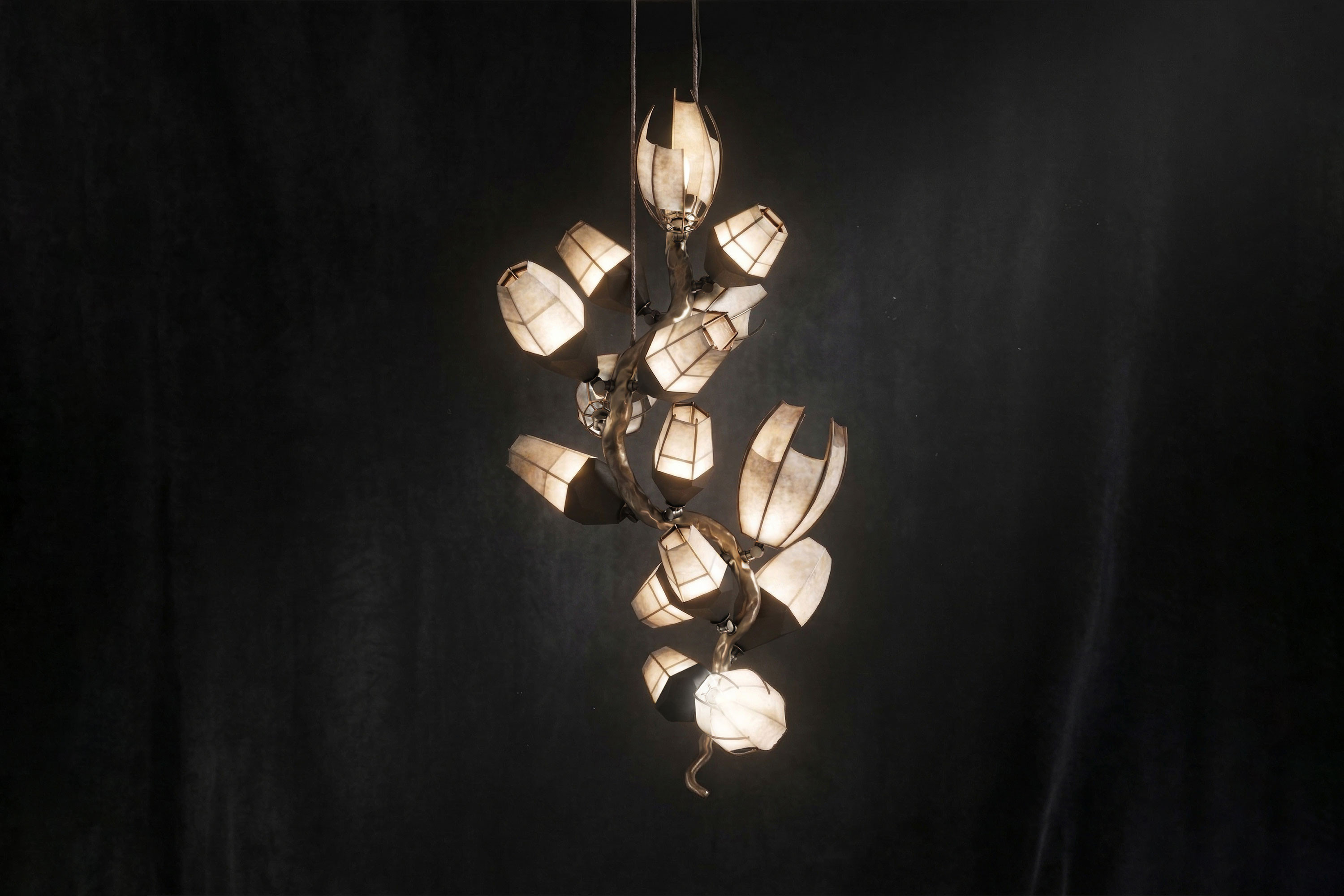 The cascading foundation features an intricate, branch-like frame masterfully cast from heavy patina bronze, grounding the airy design with a sophisticated, vintage permanence. Blooming from these twisting metallic branches are delicate, hand-stitched globes crafted from premium translucent goatskin parchment. The illuminated parchment diffuses a warm, ethereal glow that is beautifully contrasted by striking matte black accents anchoring each “blossom.” This creates a captivating visual tension between earthy, organic elegance and sharp, modern detailing.