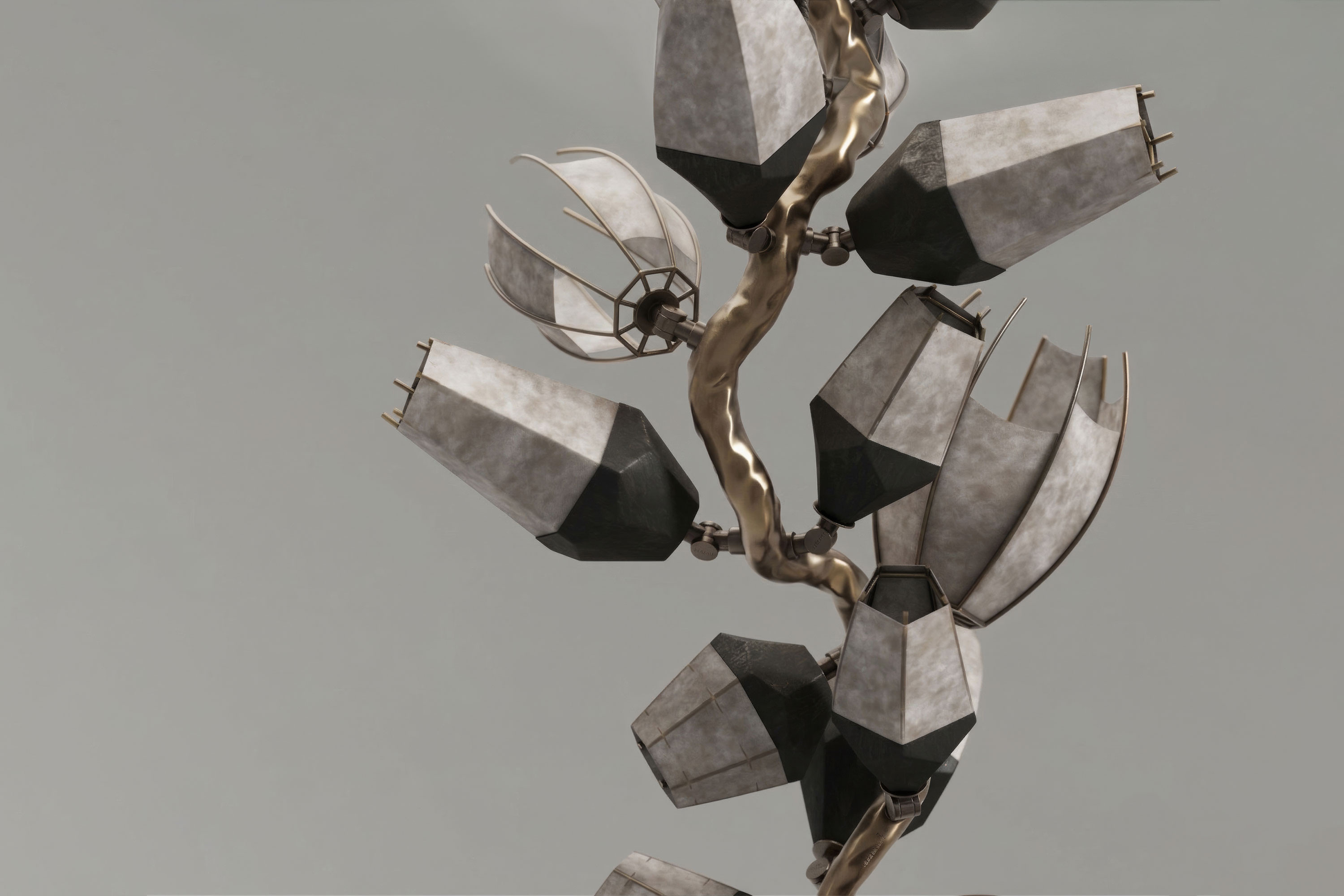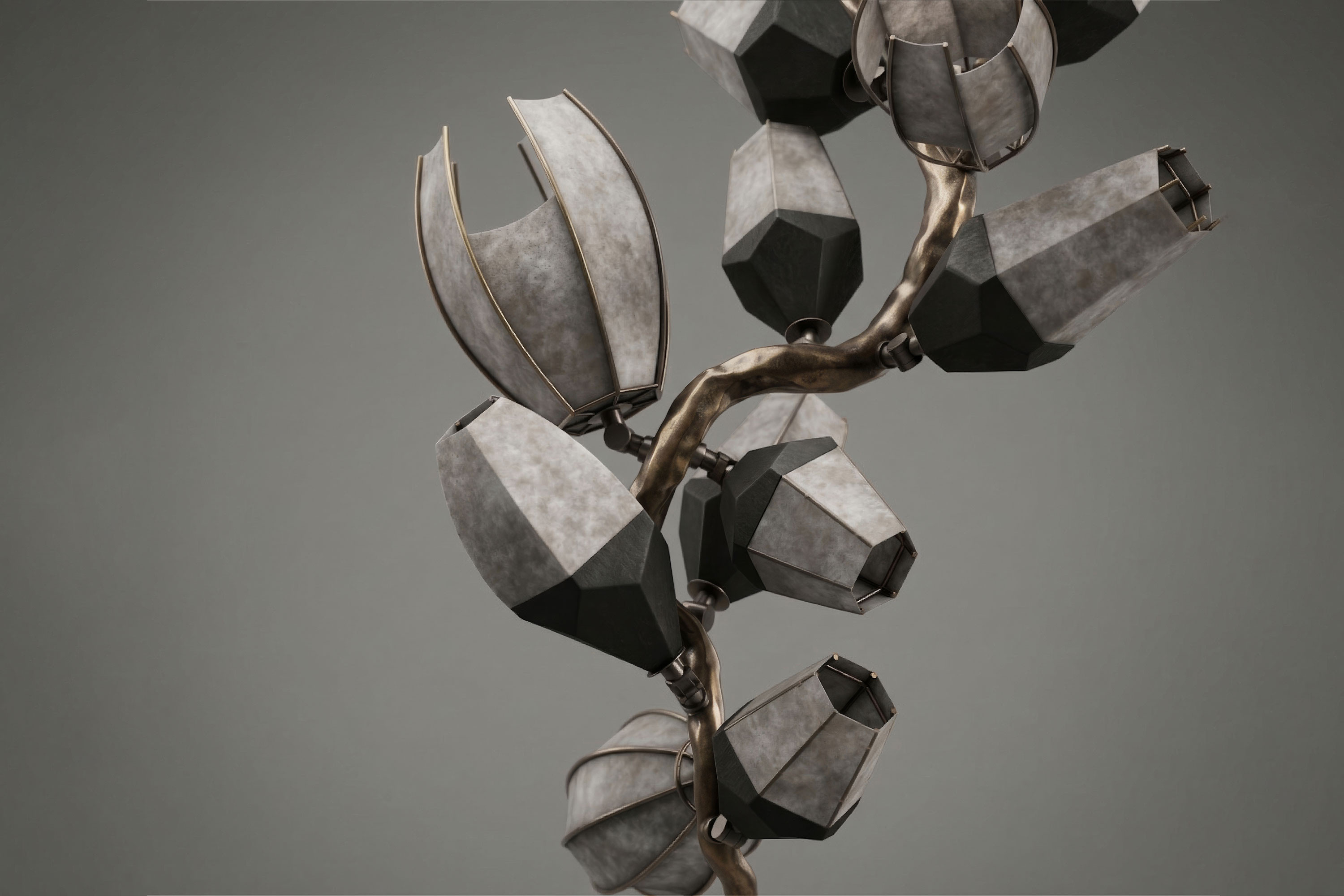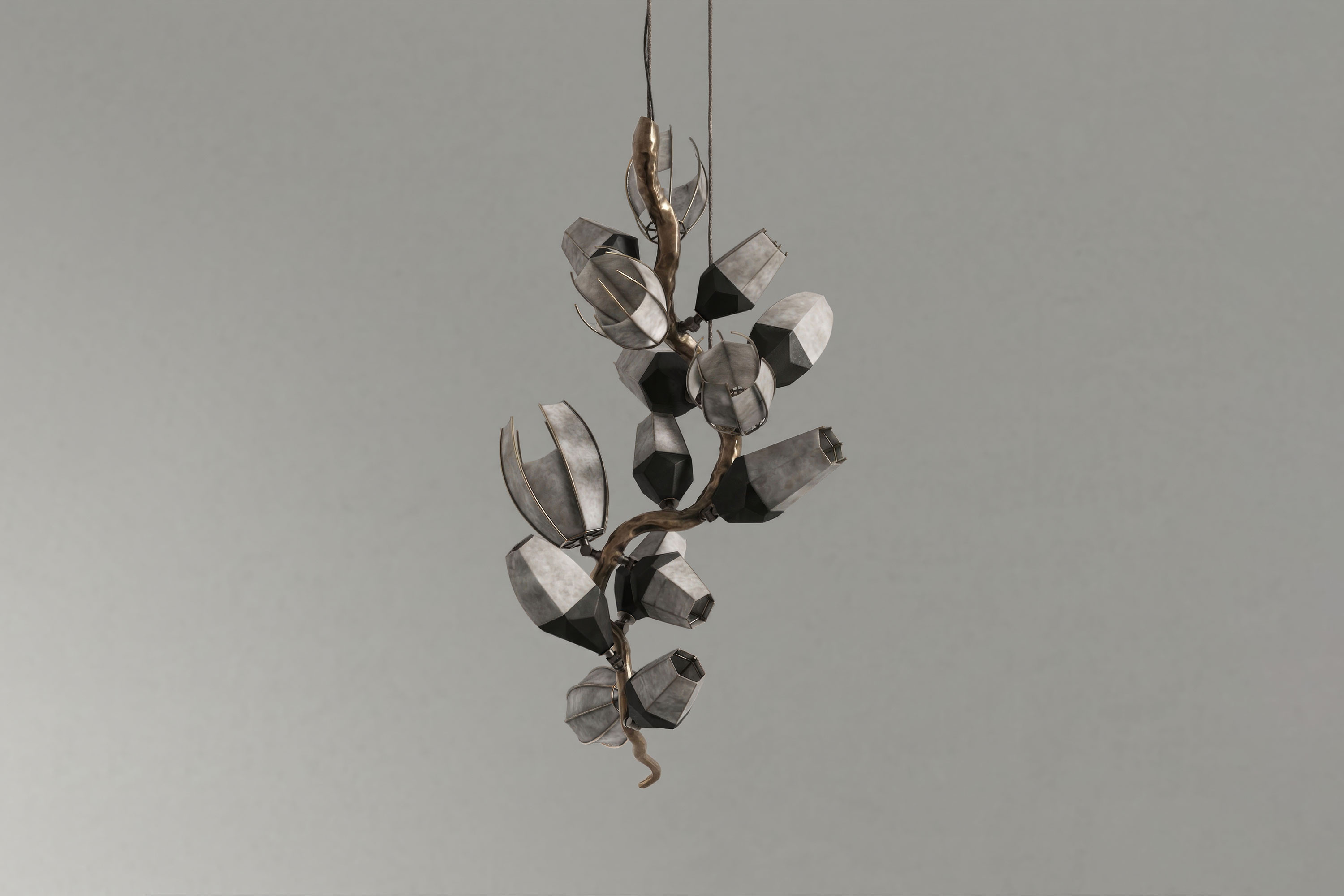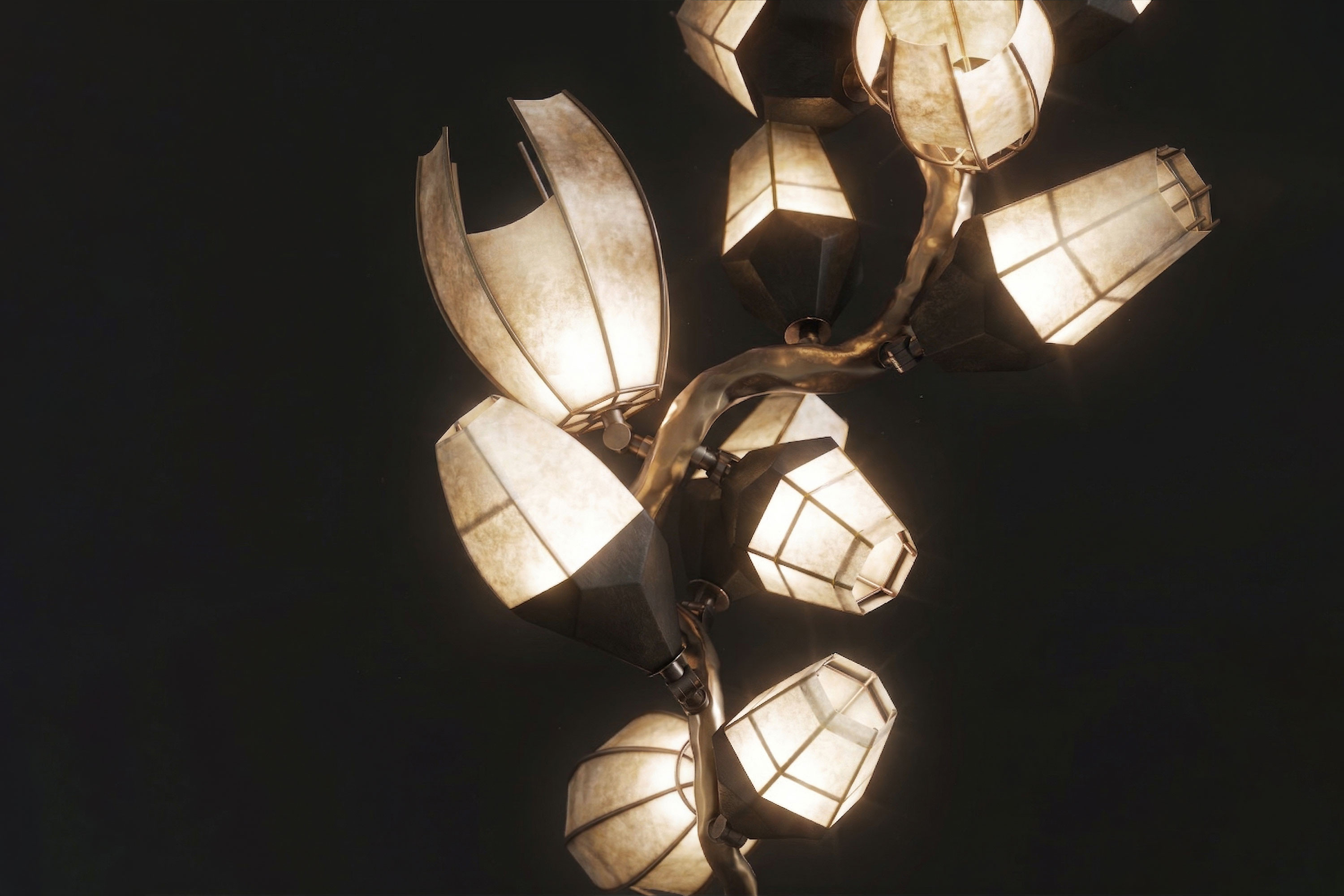 The cascading foundation features an intricate, branch-like frame masterfully cast from heavy patina bronze, grounding the airy design with a sophisticated, vintage permanence. Blooming from these twisting metallic branches are delicate, hand-stitched globes crafted from premium translucent goatskin parchment. The illuminated parchment diffuses a warm, ethereal glow that is beautifully contrasted by striking matte black accents anchoring each “blossom.” This creates a captivating visual tension between earthy, organic elegance and sharp, modern detailing.